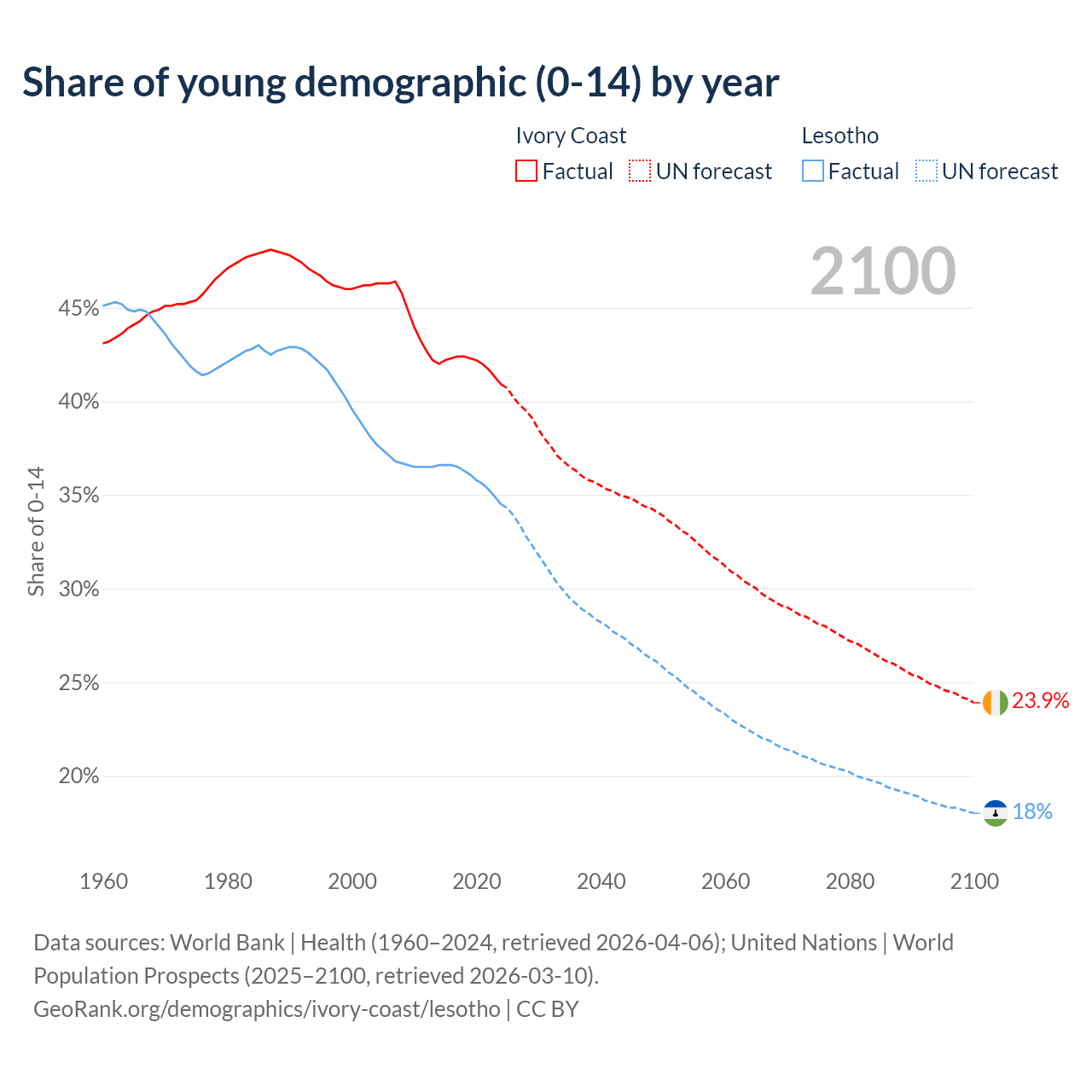 - The share of young demographic (0-15 years old) in Ivory Coast is 40.9% vs 34.5% in Lesotho.