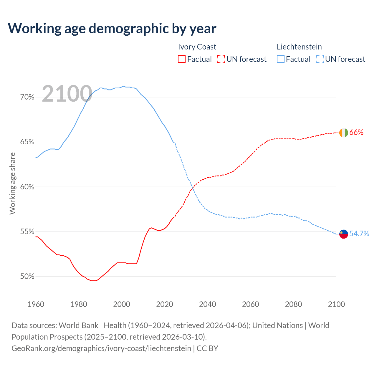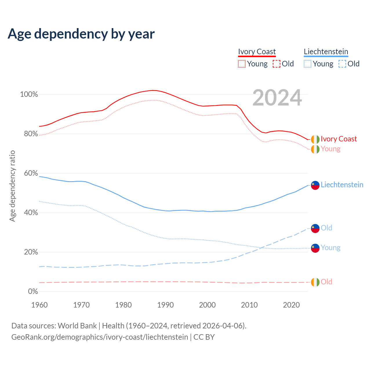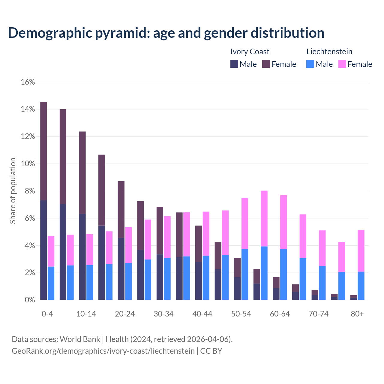 - The share of old-age demographic (65+) in Ivory Coast is 2.61% vs 20.7% in Liechtenstein.