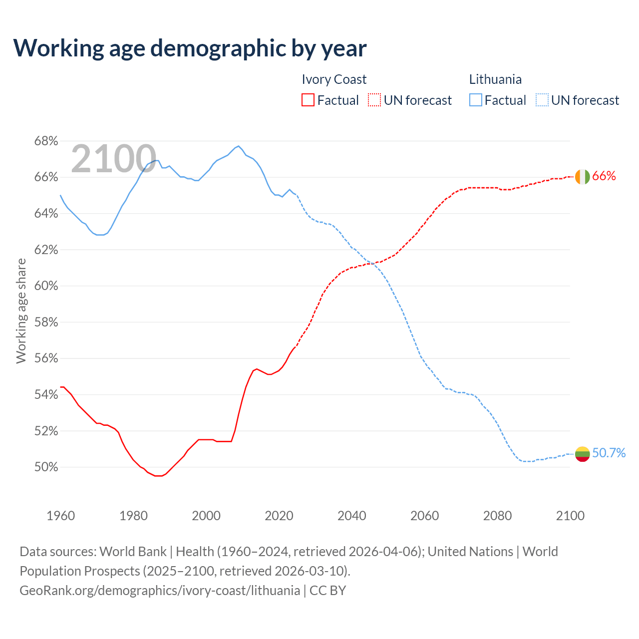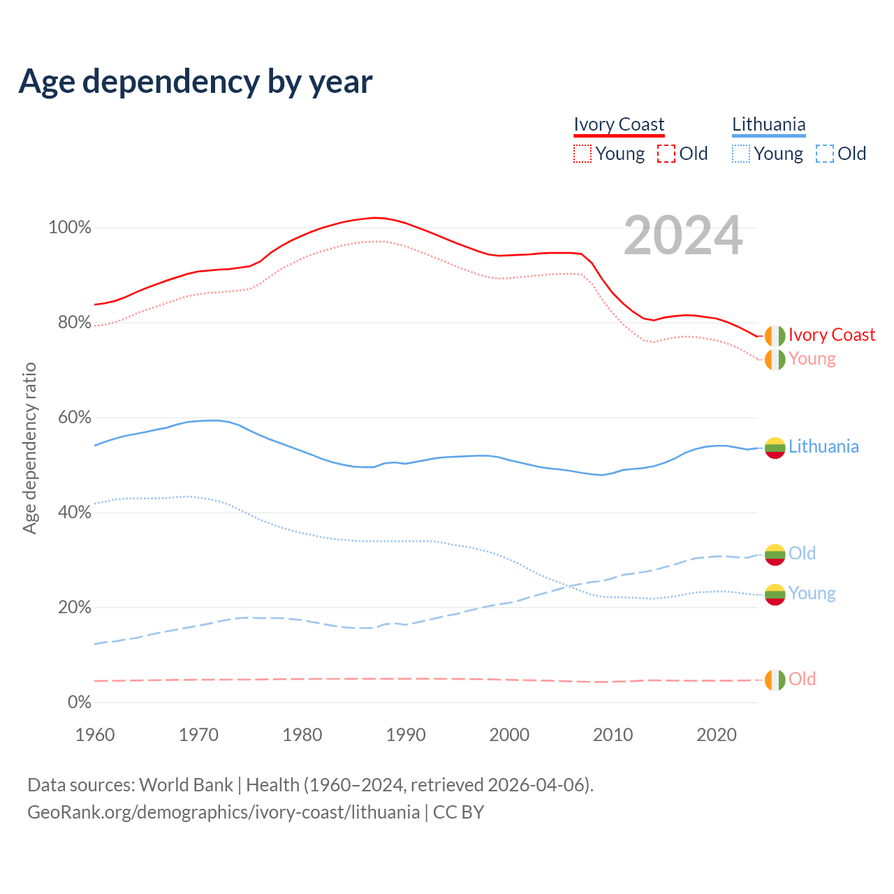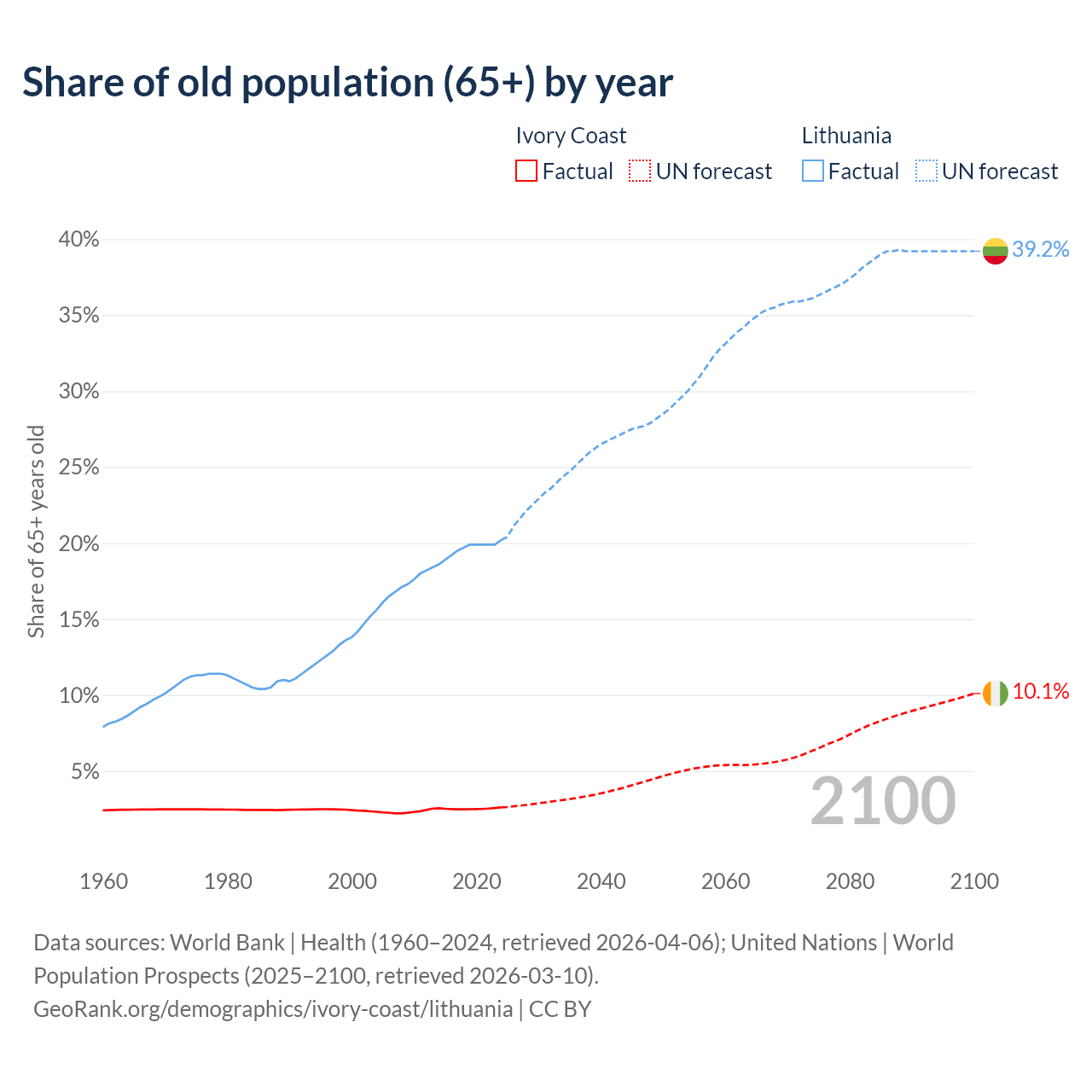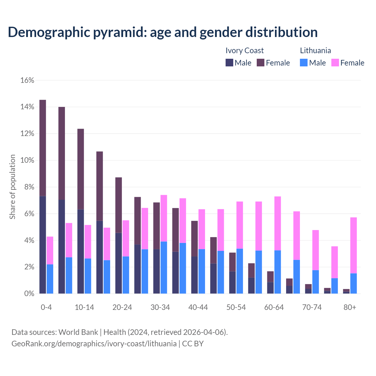 - The share of old-age demographic (65+) in Ivory Coast is 2.61% vs 20.2% in Lithuania.