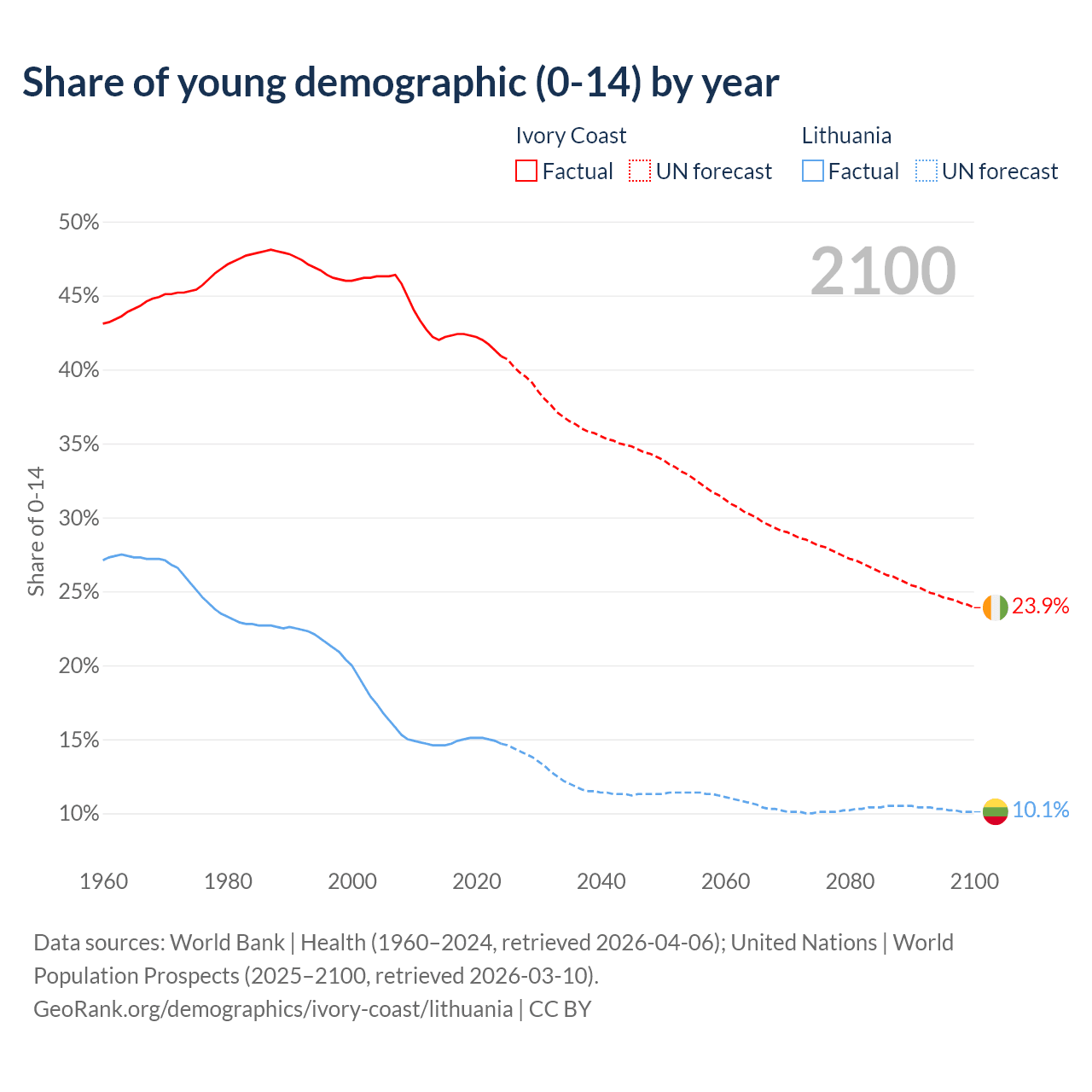 - The share of young demographic (0-15 years old) in Ivory Coast is 40.9% vs 14.7% in Lithuania.