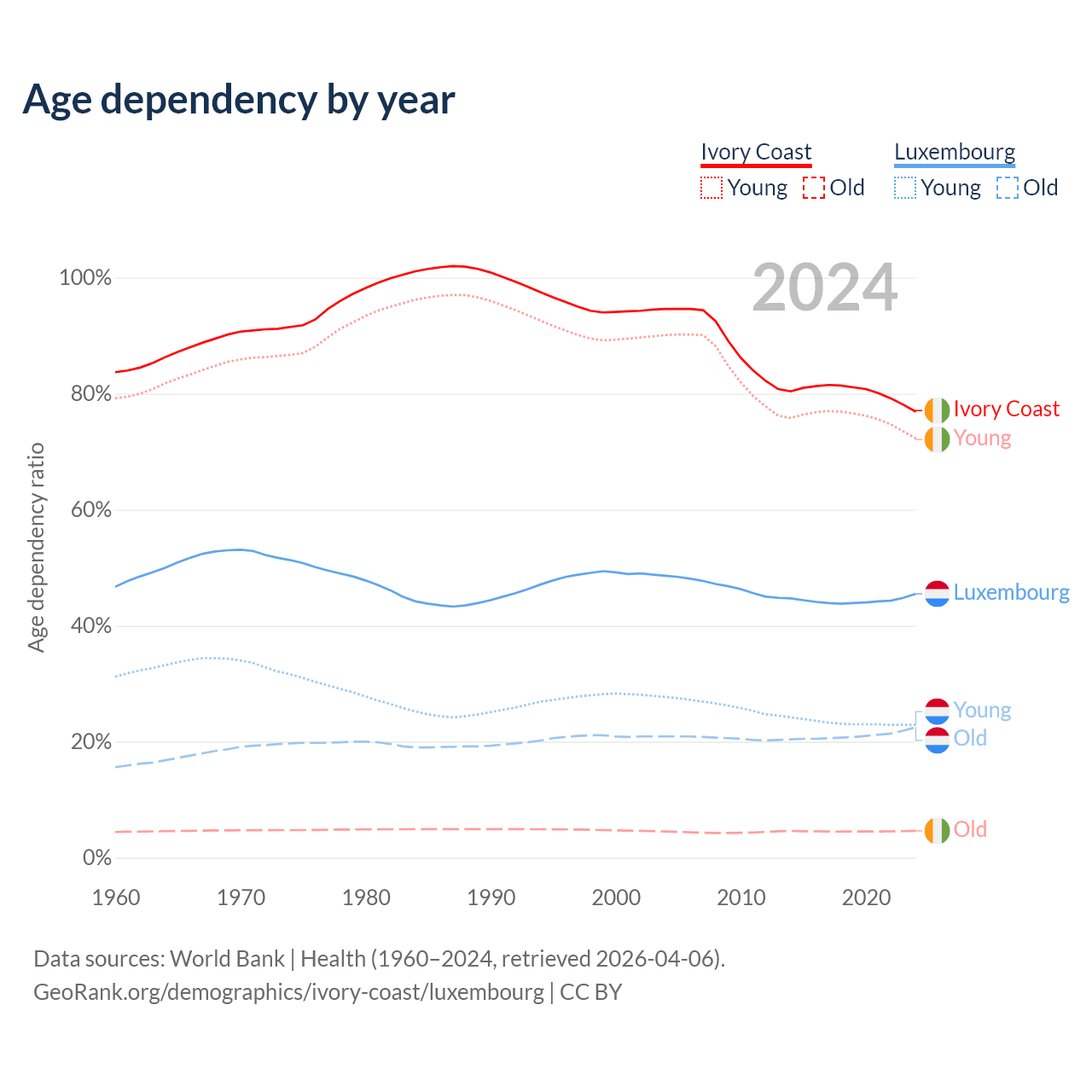 - The share of old-age demographic (65+) in Ivory Coast is 2.61% vs 15.5% in Luxembourg.