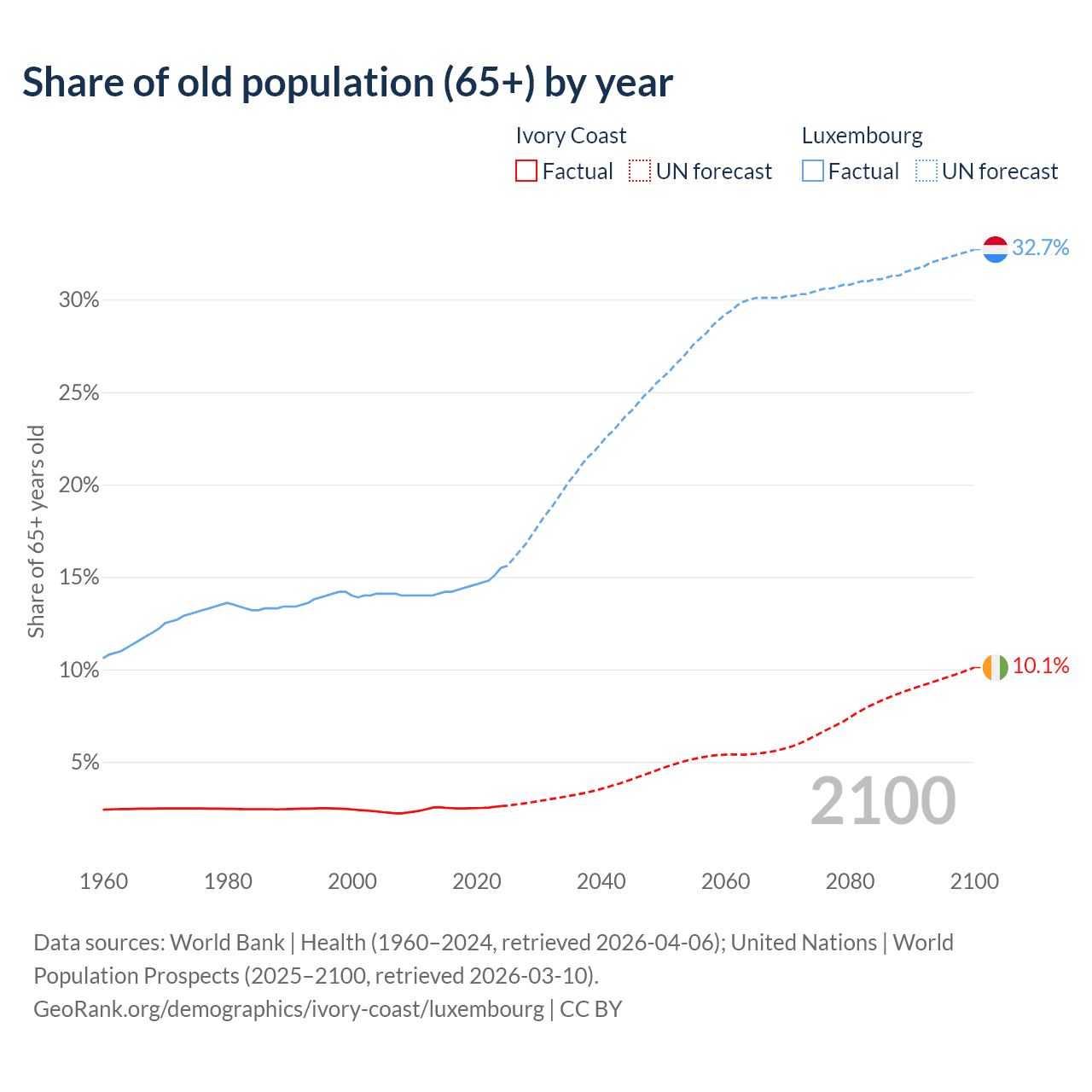 The share of older people aged 65 and over is 2.61% in Ivory Coast and 15.5% in Luxembourg. Life expectancy in Ivory Coast compared to Luxembourg .