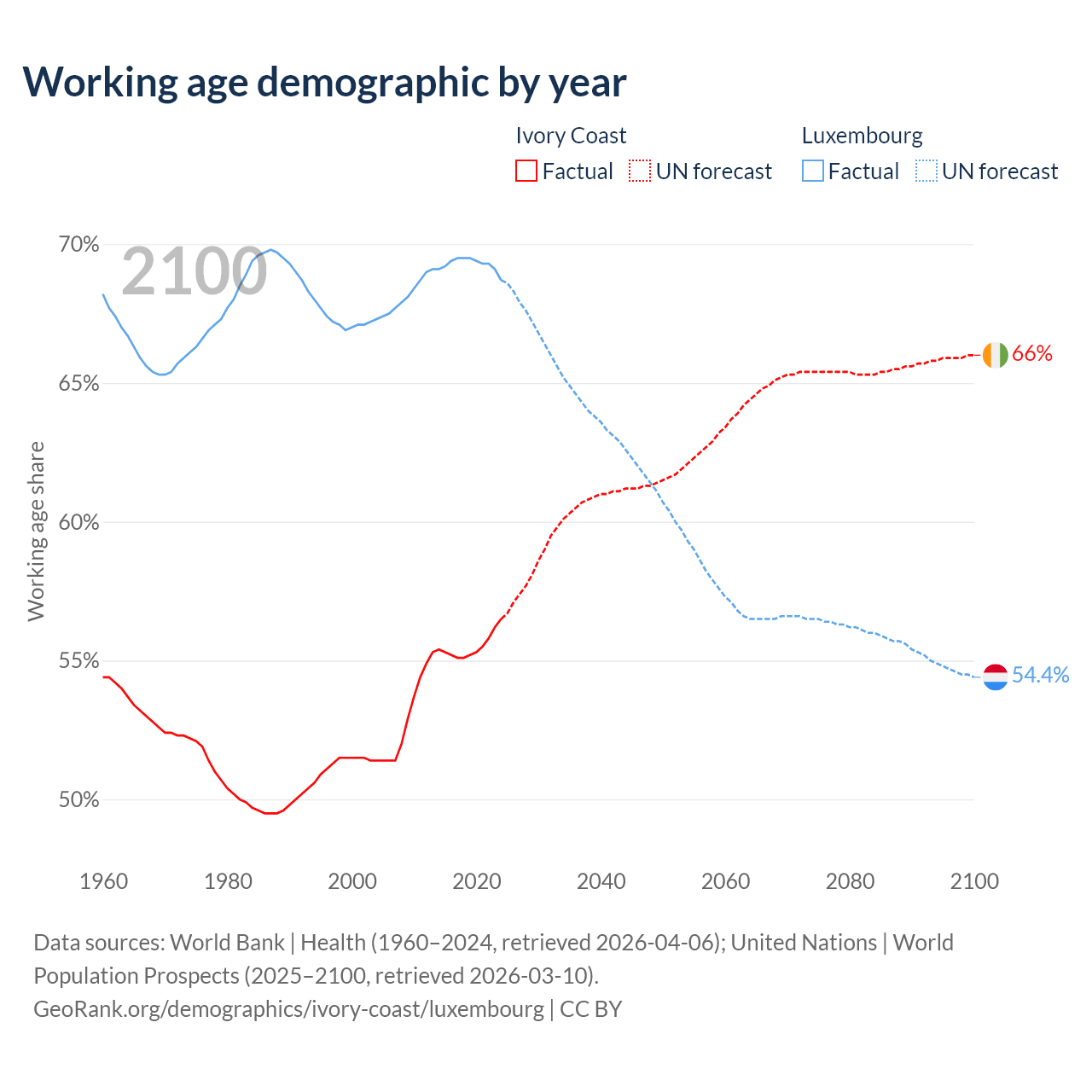 - Ivory Coast has 19.1M working age adults (aged 15-64) vs 477K in Luxembourg.