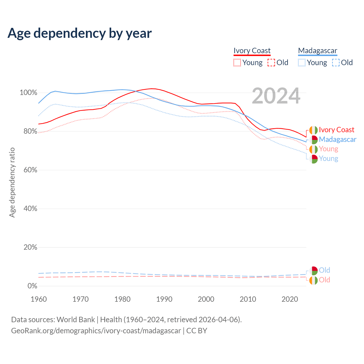 - Ivory Coast is ranked 175/196 by median age (oldest to youngest) vs 165/196 for Madagascar.