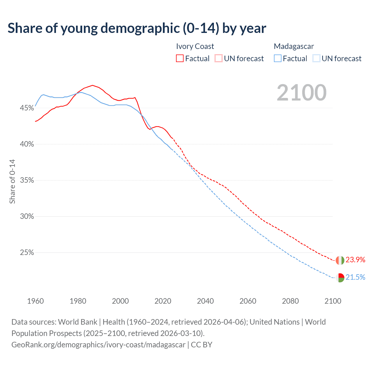 - The share of young demographic (0-15 years old) in Ivory Coast is 40.9% vs 39.3% in Madagascar.