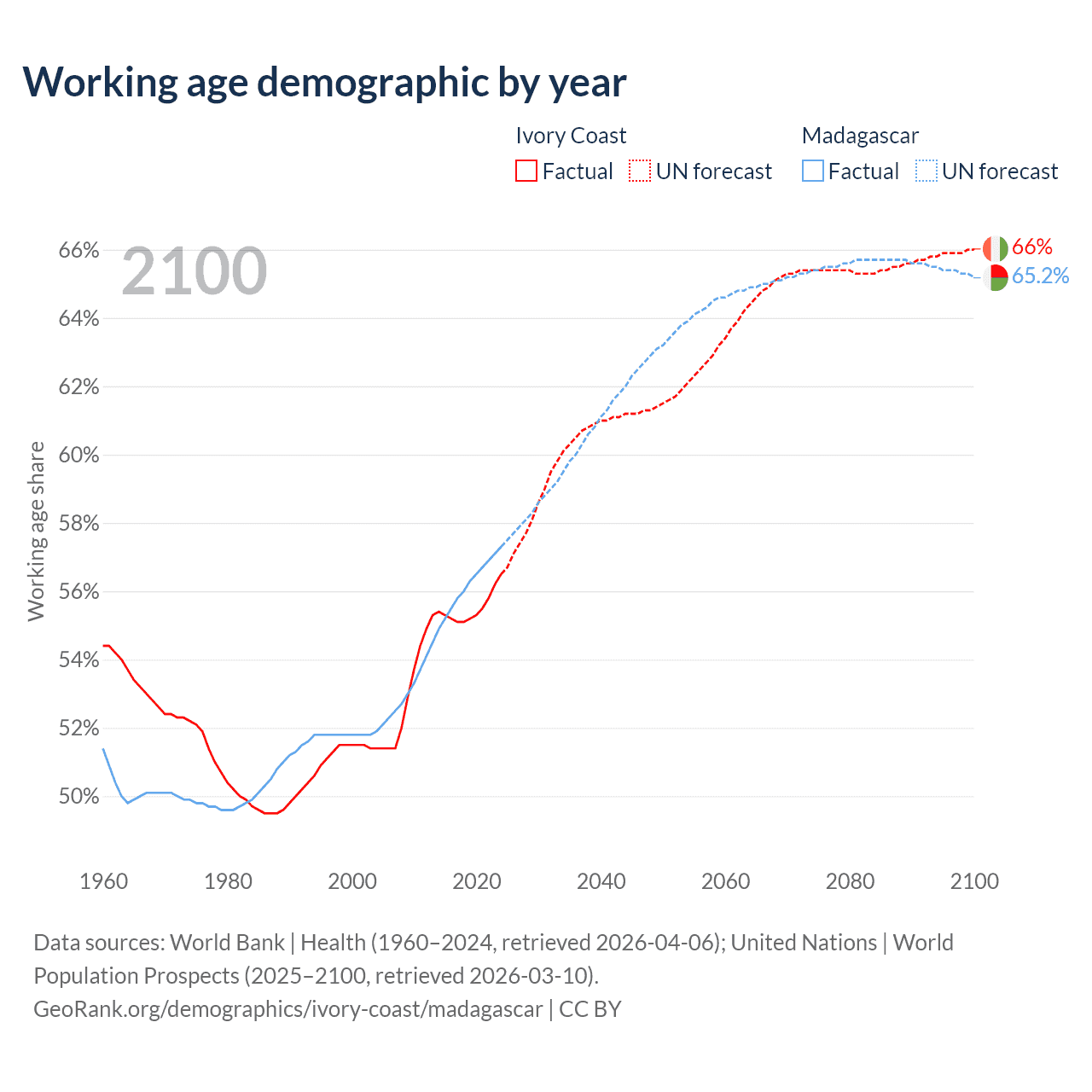 - Ivory Coast has 19.1M working age adults (aged 15-64) vs 19.4M in Madagascar.