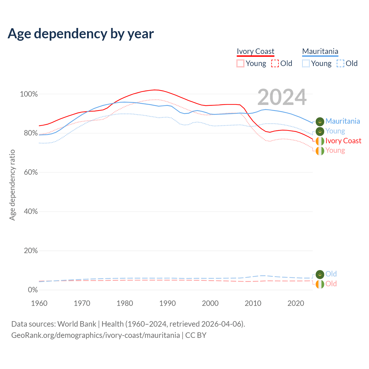 - Ivory Coast is ranked 175/196 by median age (oldest to youngest) vs 185/196 for Mauritania.