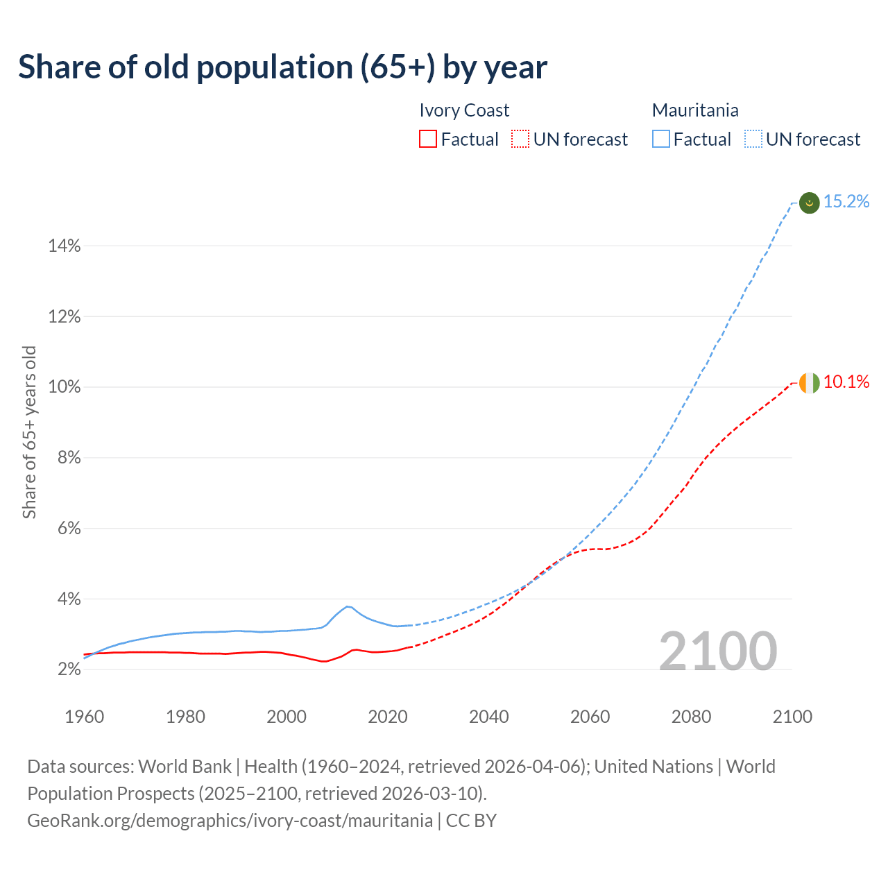 The share of older people aged 65 and over is 2.61% in Ivory Coast and 3.23% in Mauritania. Life expectancy in Ivory Coast compared to Mauritania .