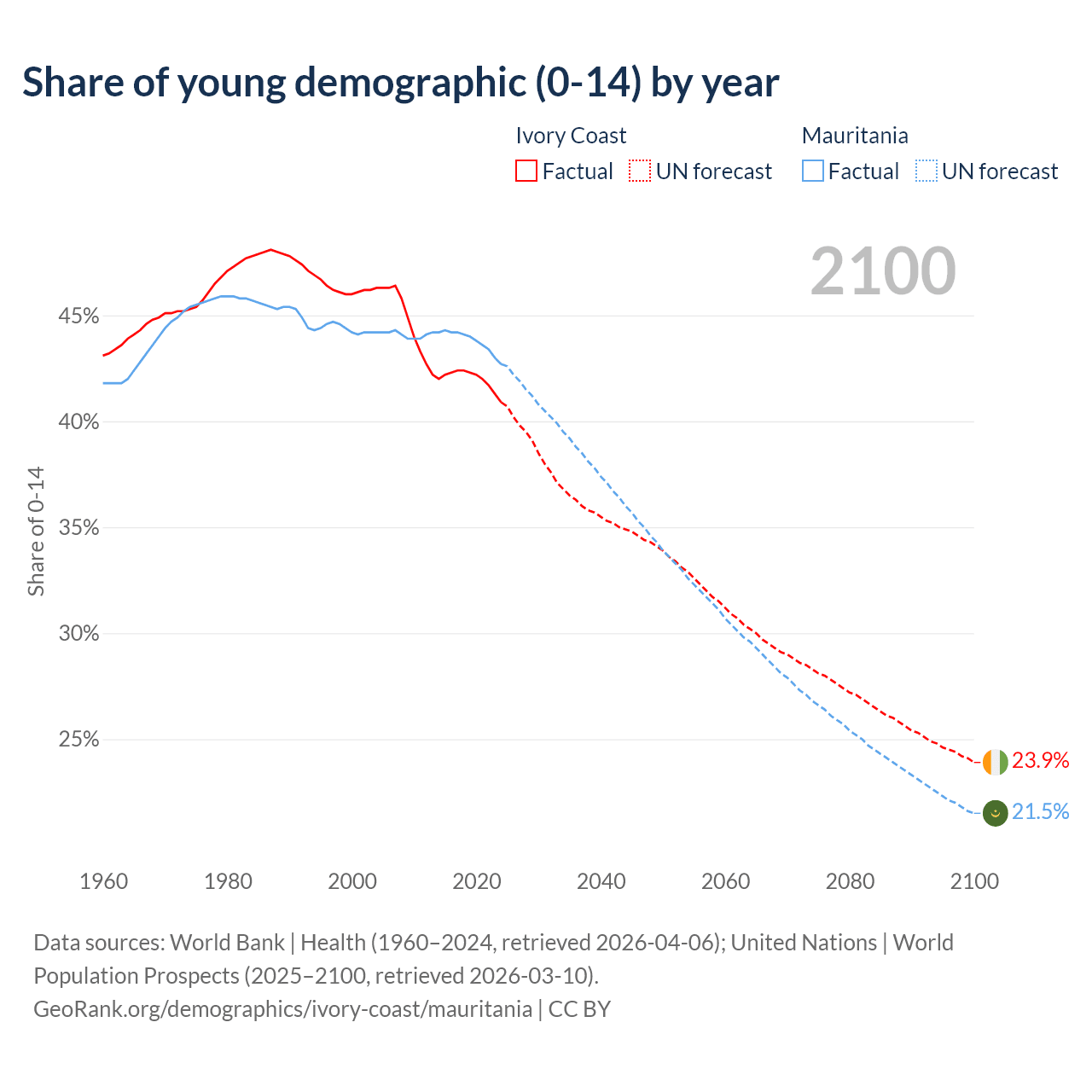- The share of young demographic (0-15 years old) in Ivory Coast is 40.9% vs 42.7% in Mauritania.