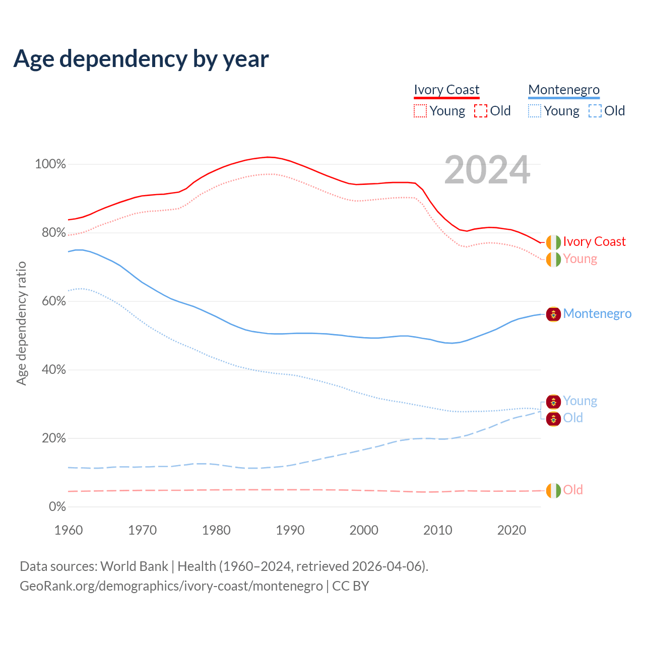 - Ivory Coast is ranked 175/196 by median age (oldest to youngest) vs 45/196 for Montenegro.