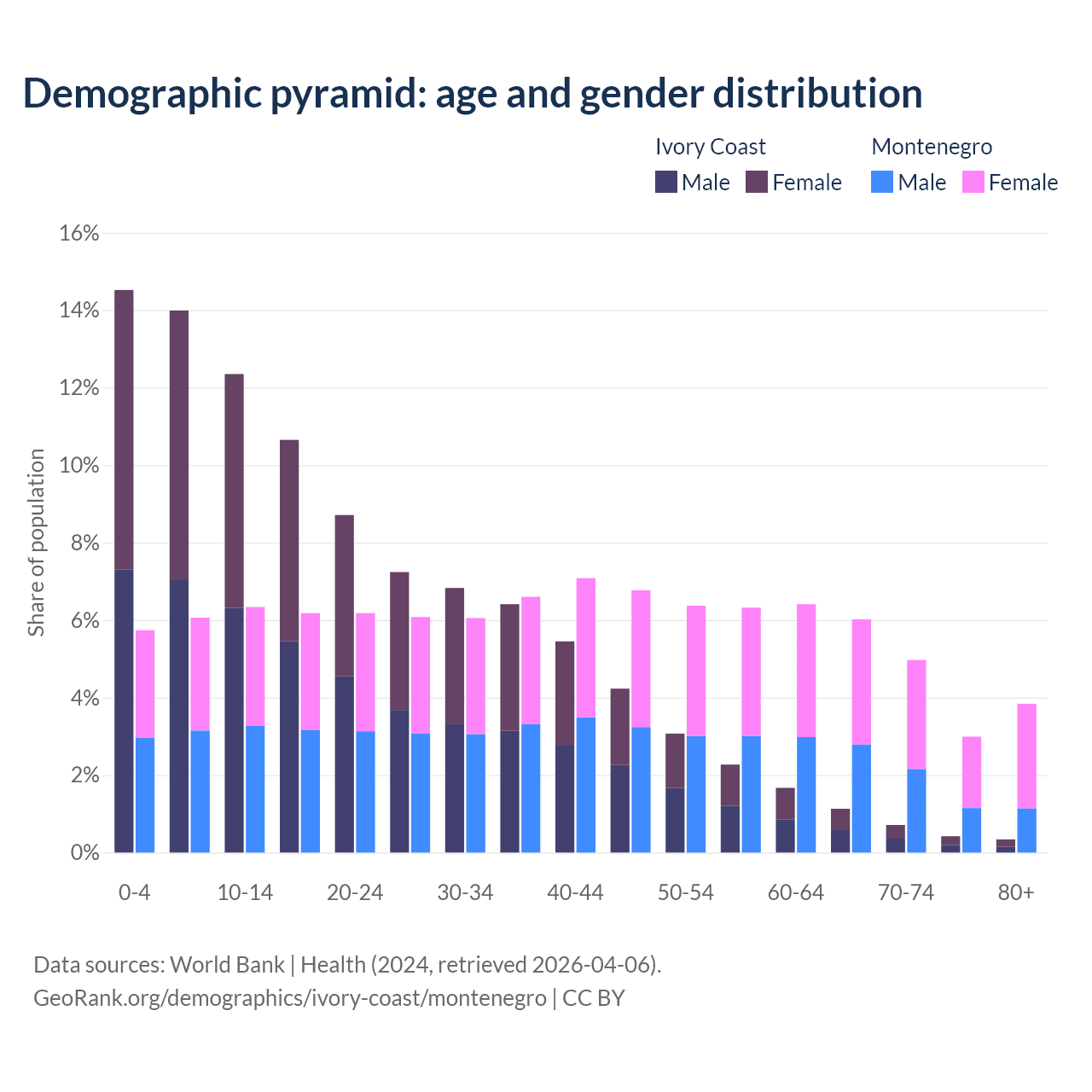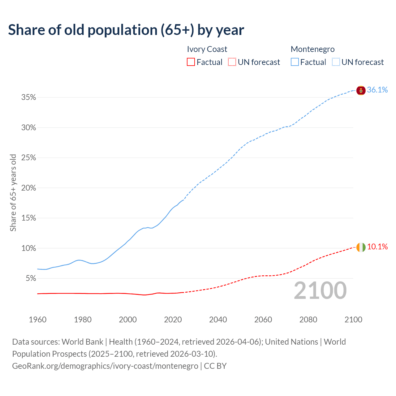 The share of older people aged 65 and over is 2.61% in Ivory Coast and 17.8% in Montenegro. Life expectancy in Ivory Coast compared to Montenegro .