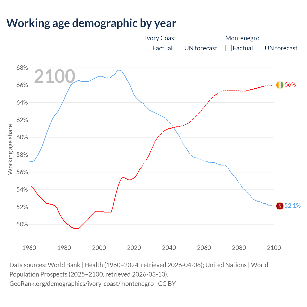 Median age Ivory Coast vs Montenegro, 1960-2100