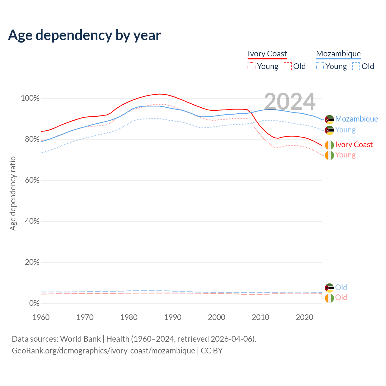 - Ivory Coast is ranked 175/196 by median age (oldest to youngest) vs 189/196 for Mozambique.