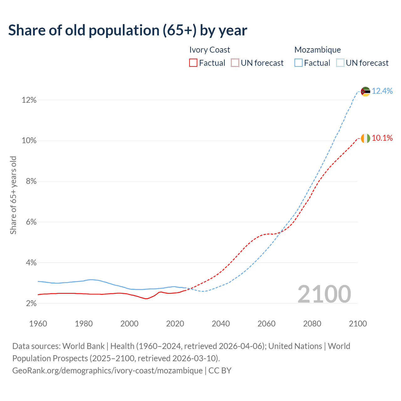 - The share of old-age demographic (65+) in Ivory Coast is 2.61% vs 2.75% in Mozambique.