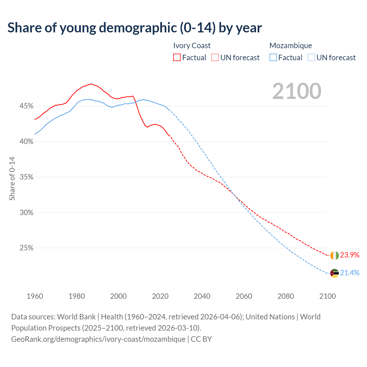 - The share of young demographic (0-15 years old) in Ivory Coast is 40.9% vs 44.5% in Mozambique.