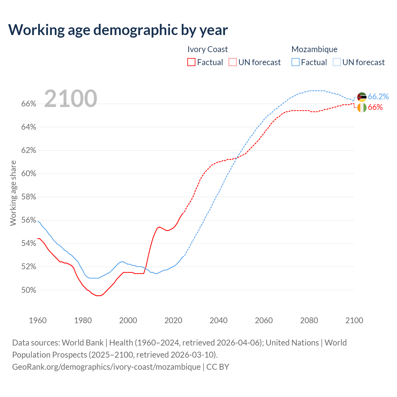 The share of older people aged 65 and over is 2.61% in Ivory Coast and 2.75% in Mozambique. Life expectancy in Ivory Coast compared to Mozambique .