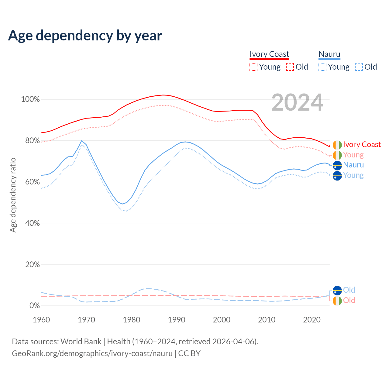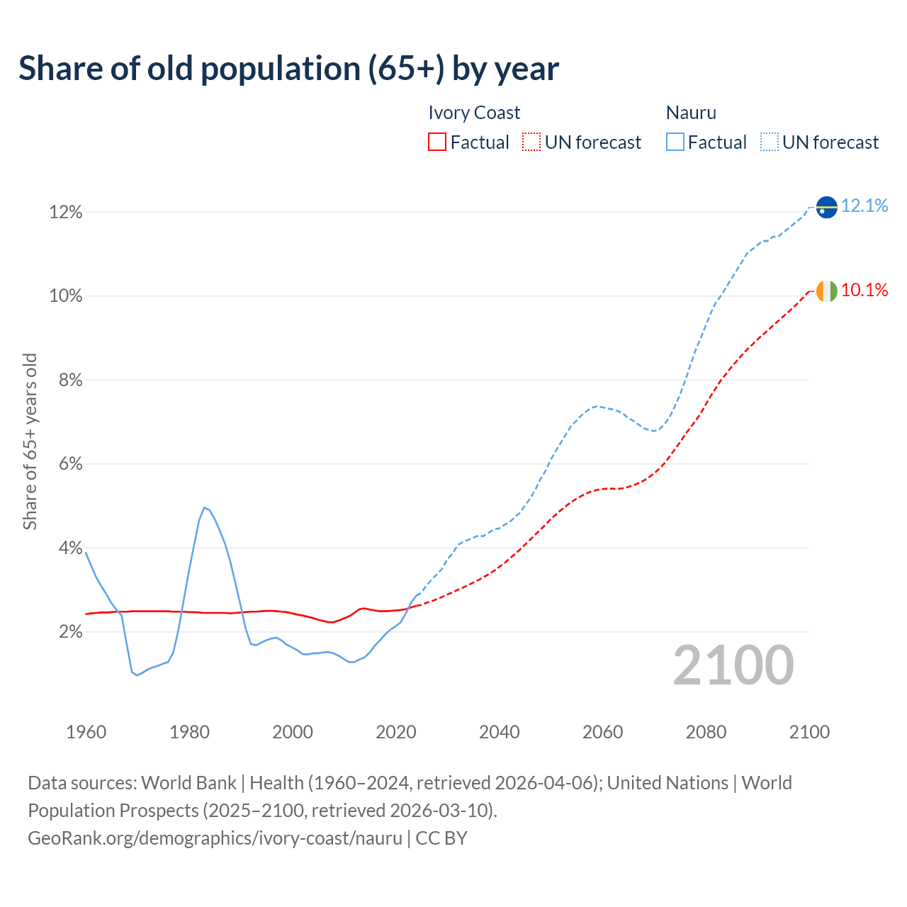 - The share of old-age demographic (65+) in Ivory Coast is 2.61% vs 2.85% in Nauru.