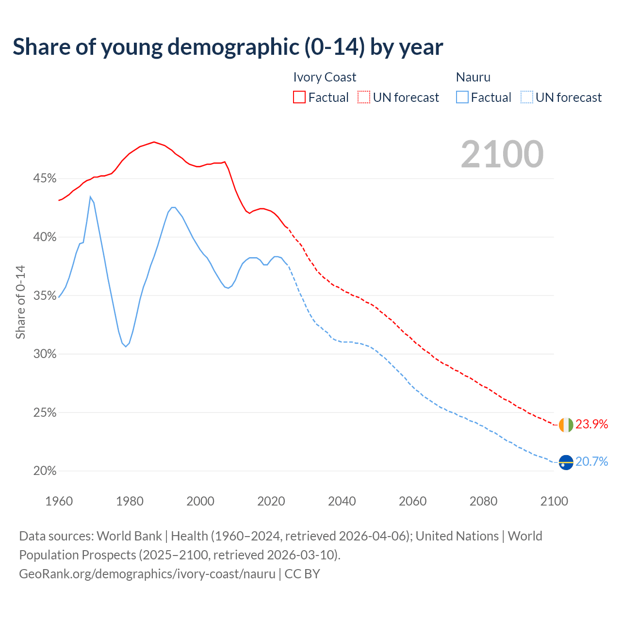 - The share of young demographic (0-15 years old) in Ivory Coast is 40.9% vs 37.8% in Nauru.