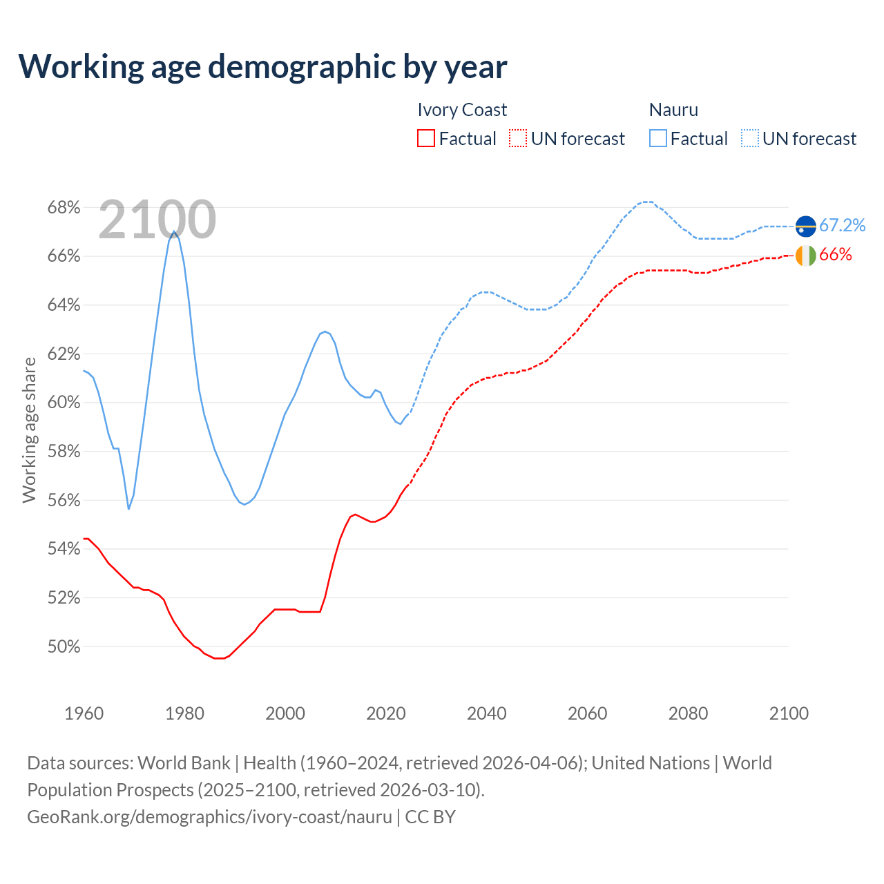 - Ivory Coast has 19.1M working age adults (aged 15-64) vs 7.2K in Nauru.