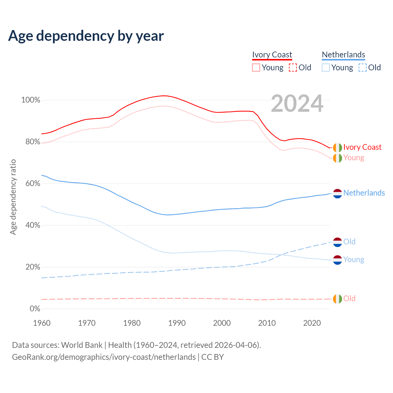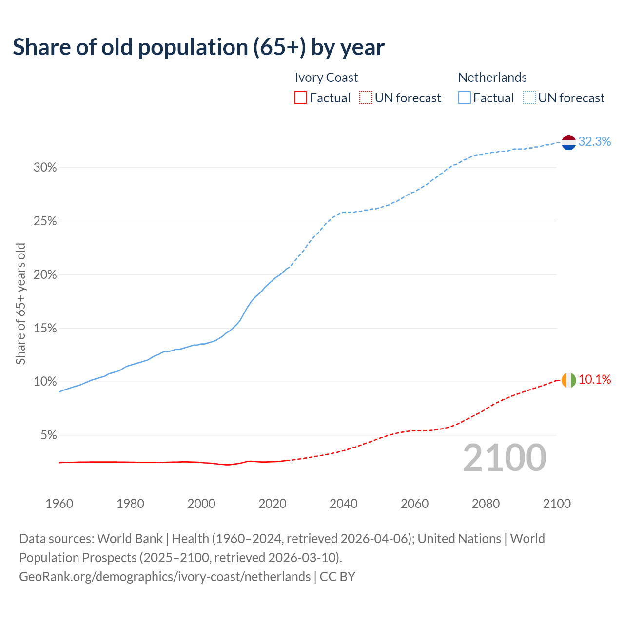 - The share of old-age demographic (65+) in Ivory Coast is 2.61% vs 20.5% in the Netherlands.