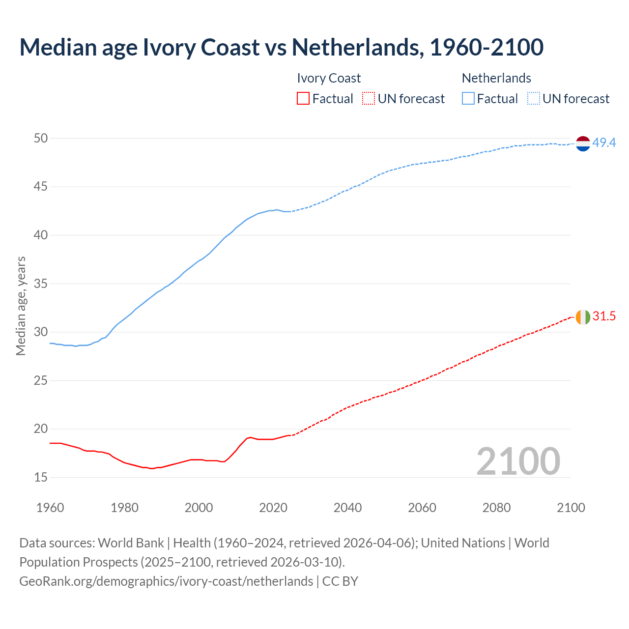 - The median age in Ivory Coast is 19.3 years compared to 42.4 years in the Netherlands.
