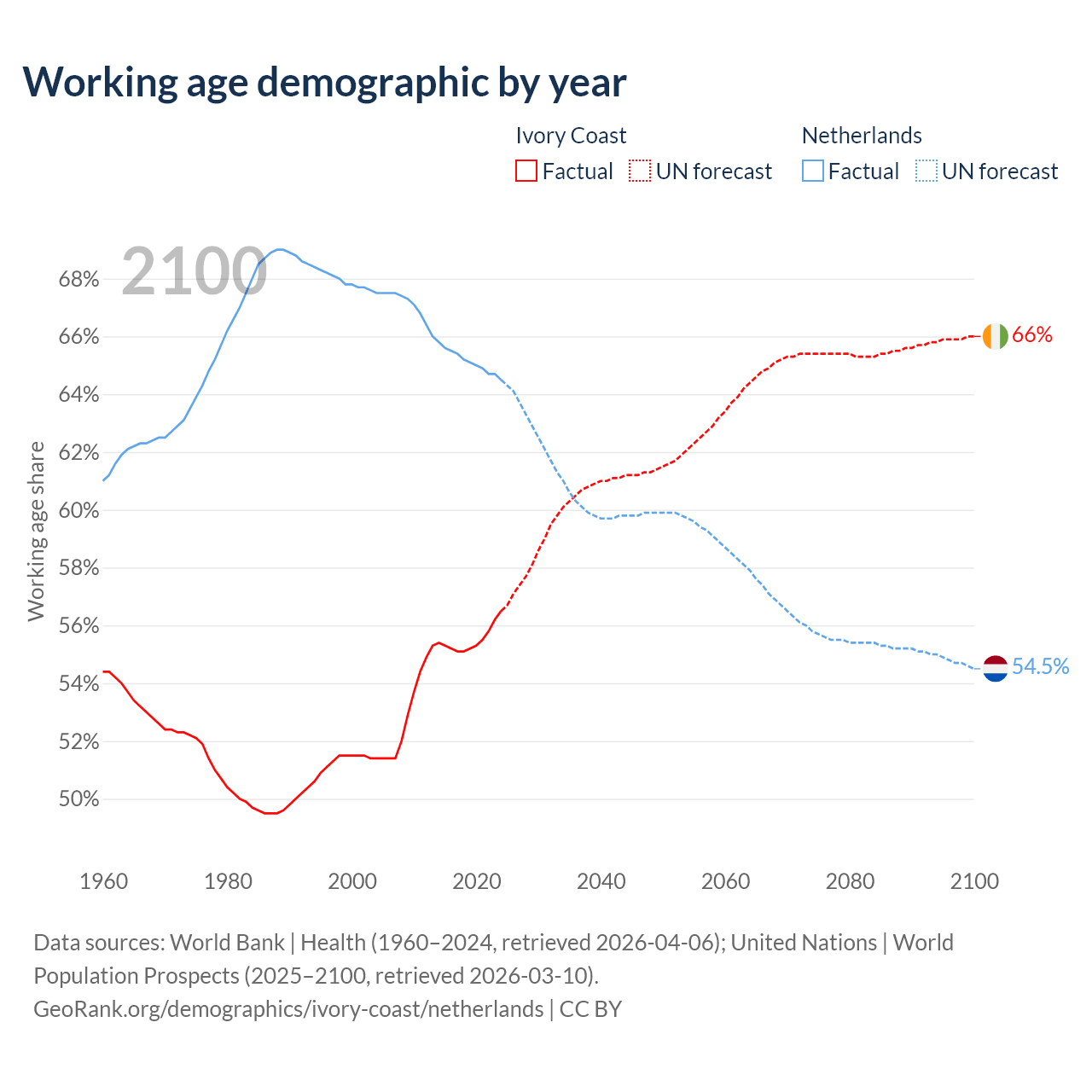 - Ivory Coast has 19.1M working age adults (aged 15-64) vs 11.8M in the Netherlands.