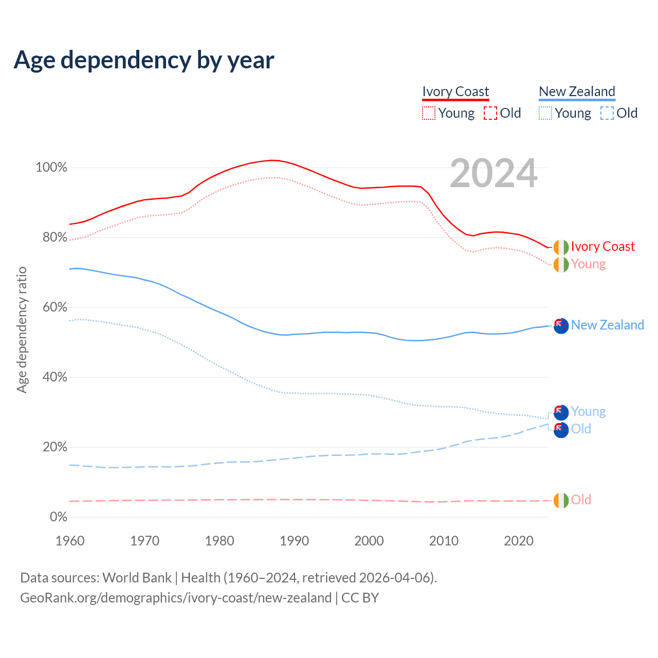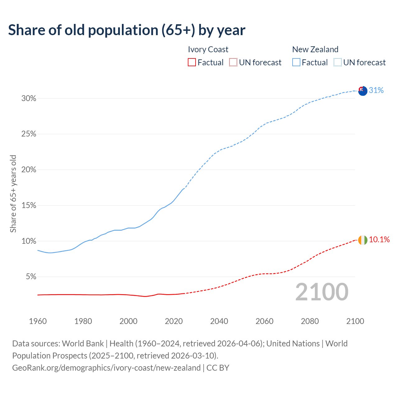 - The share of old-age demographic (65+) in Ivory Coast is 2.61% vs 17.2% in New Zealand.