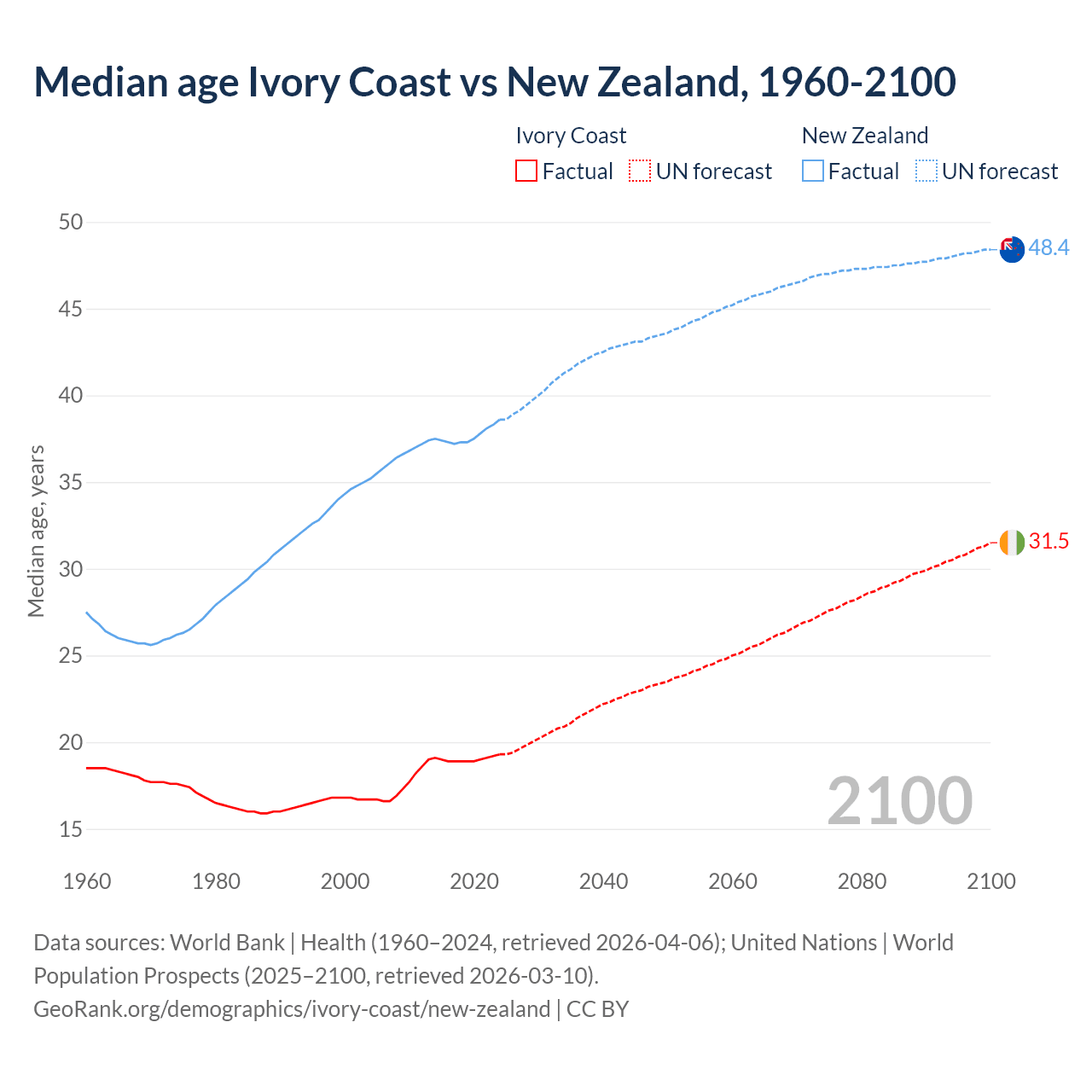 - The median age in Ivory Coast is 19.3 years compared to 38.6 years in New Zealand.