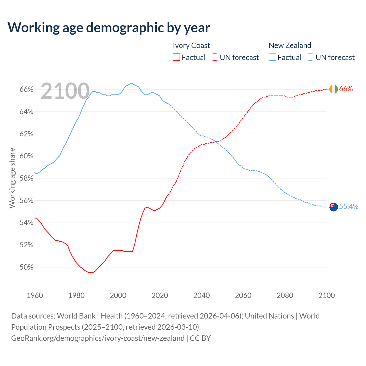 - Ivory Coast has 19.1M working age adults (aged 15-64) vs 3.48M in New Zealand.