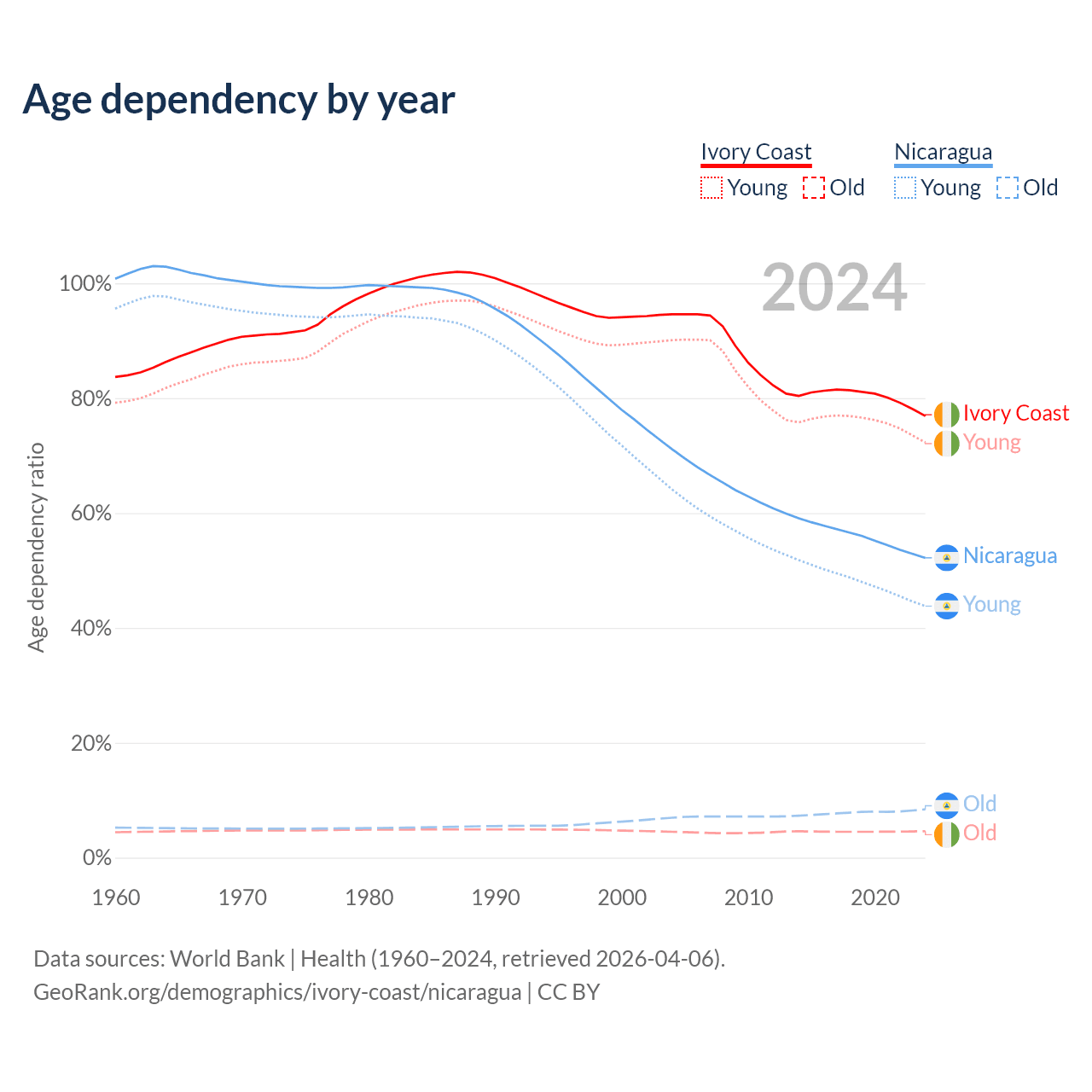 - Ivory Coast is ranked 175/196 by median age (oldest to youngest) vs 125/196 for Nicaragua.