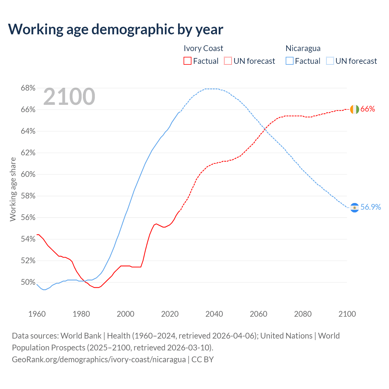 - Ivory Coast has 19.1M working age adults (aged 15-64) vs 4.68M in Nicaragua.