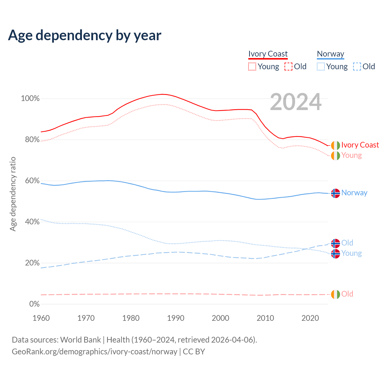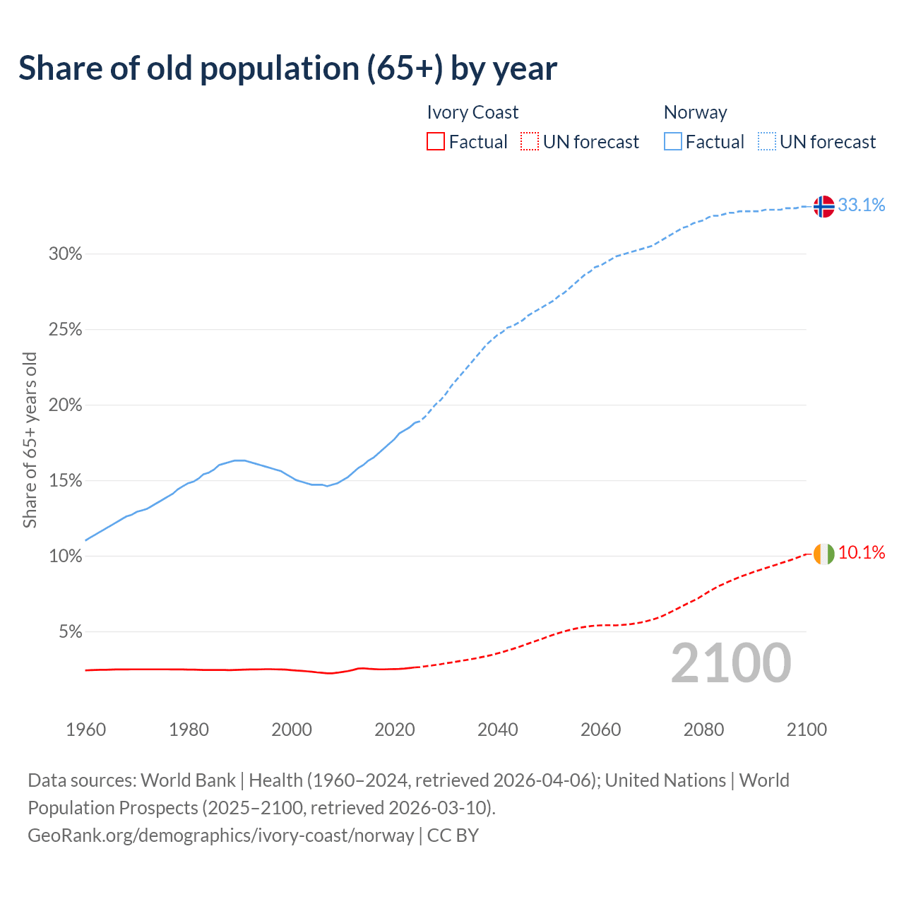 - The share of old-age demographic (65+) in Ivory Coast is 2.61% vs 18.8% in Norway.