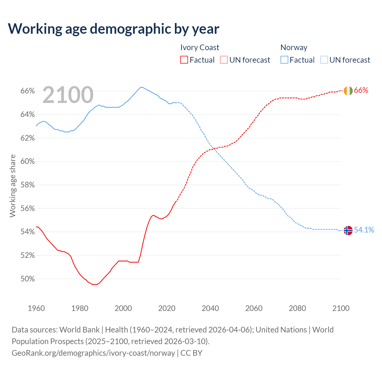 - The share of young demographic (0-15 years old) in Ivory Coast is 40.9% vs 16.2% in Norway.