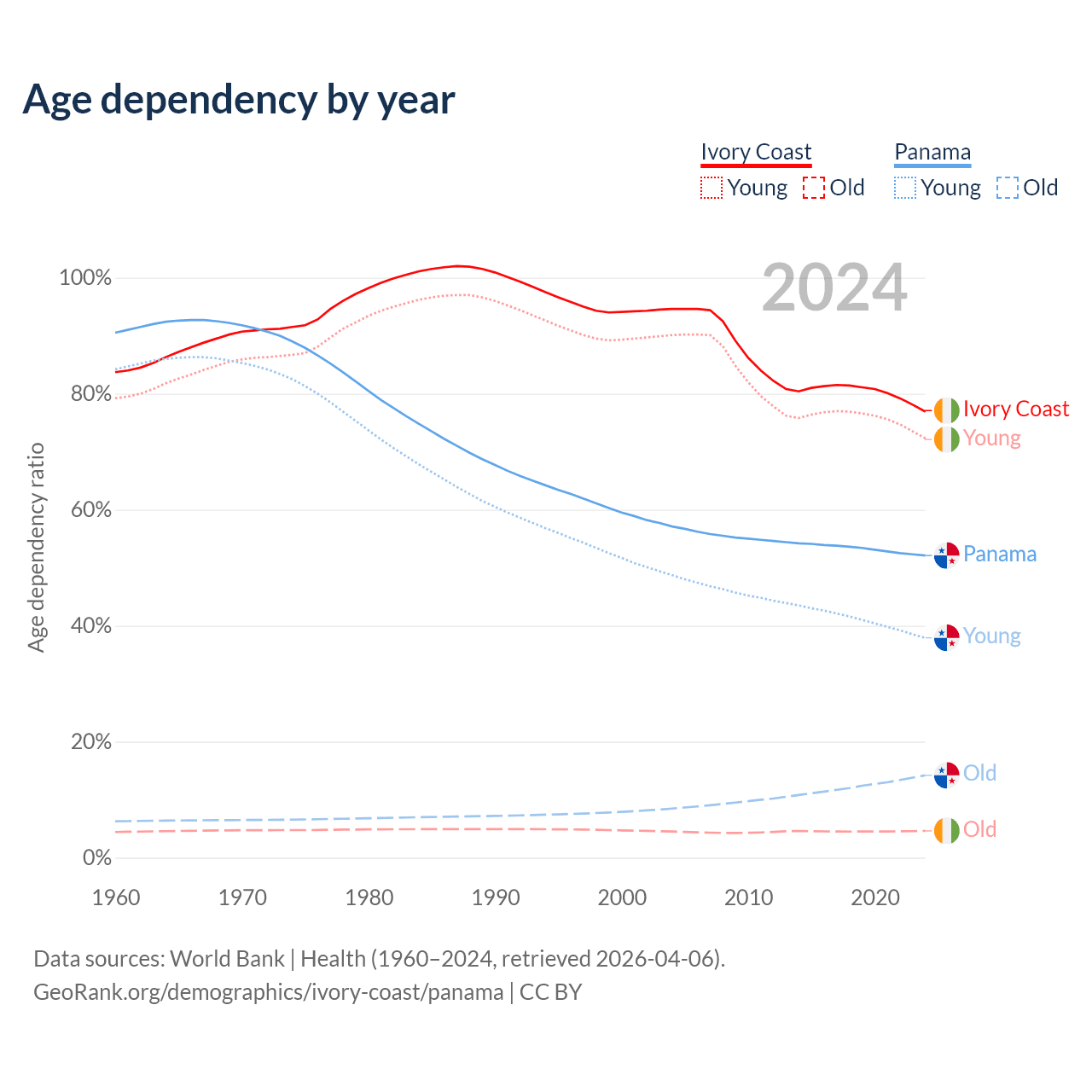 - Ivory Coast is ranked 175/196 by median age (oldest to youngest) vs 94/196 for Panama.