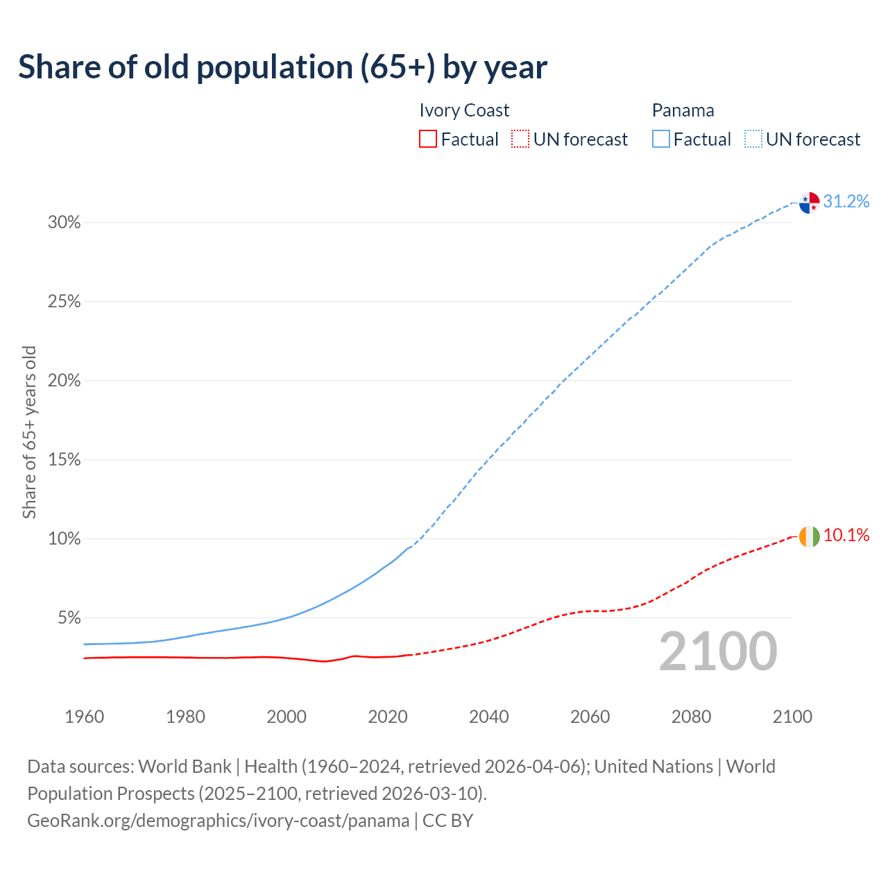 The share of older people aged 65 and over is 2.61% in Ivory Coast and 9.35% in Panama. Life expectancy in Ivory Coast compared to Panama .