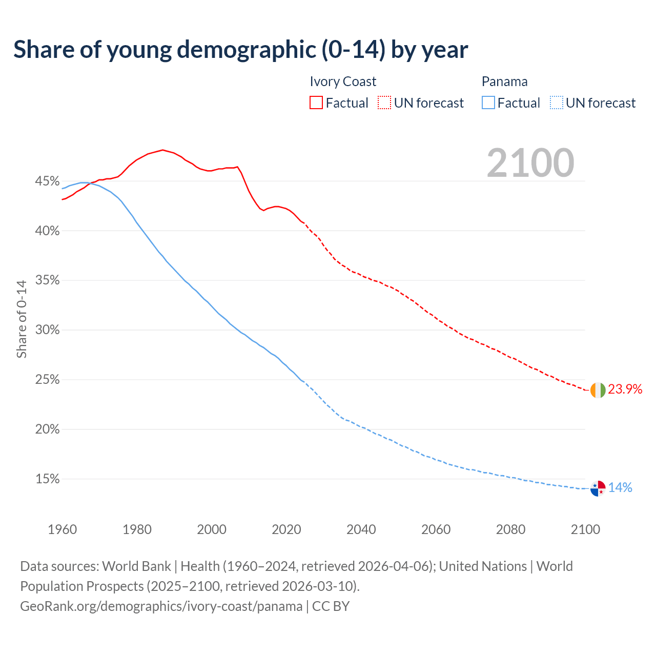 - The share of young demographic (0-15 years old) in Ivory Coast is 40.9% vs 24.9% in Panama.