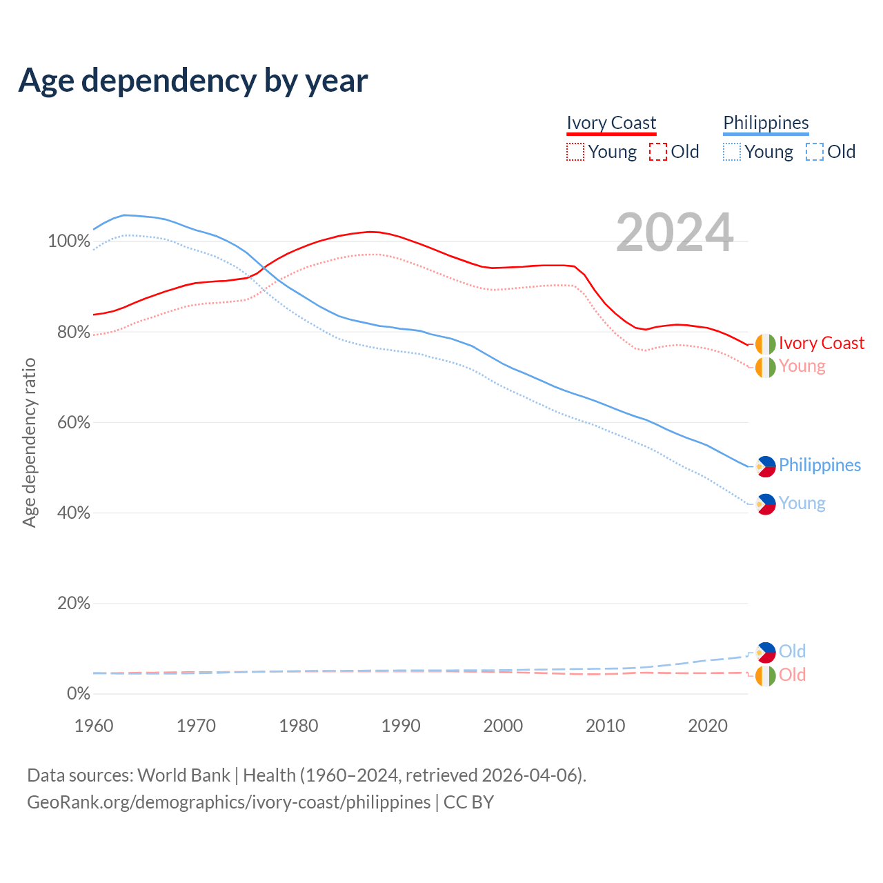 - Ivory Coast is ranked 175/196 by median age (oldest to youngest) vs 123/196 for the Philippines.