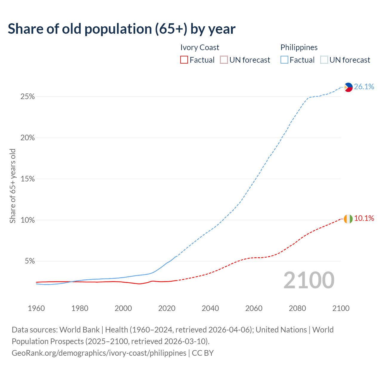 The share of older people aged 65 and over is 2.61% in Ivory Coast and 5.49% in the Philippines. Life expectancy in Ivory Coast compared to the Philippines .