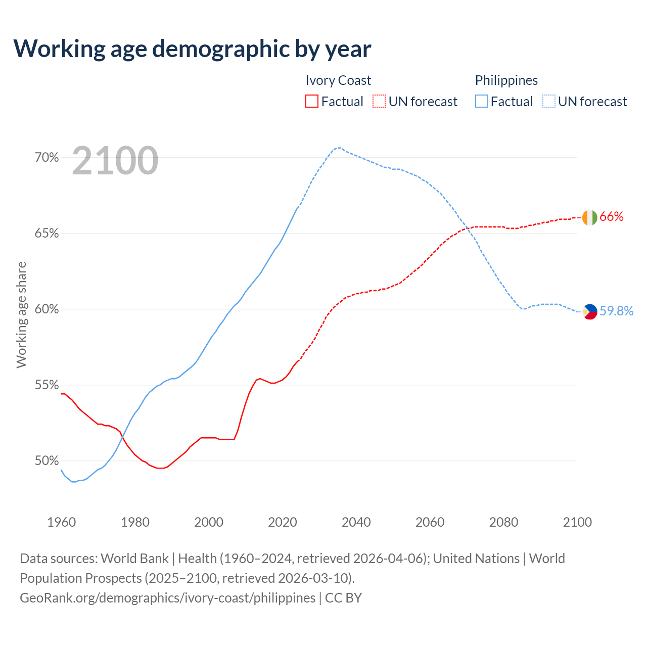 - Ivory Coast has 19.1M working age adults (aged 15-64) vs 78.6M in the Philippines.