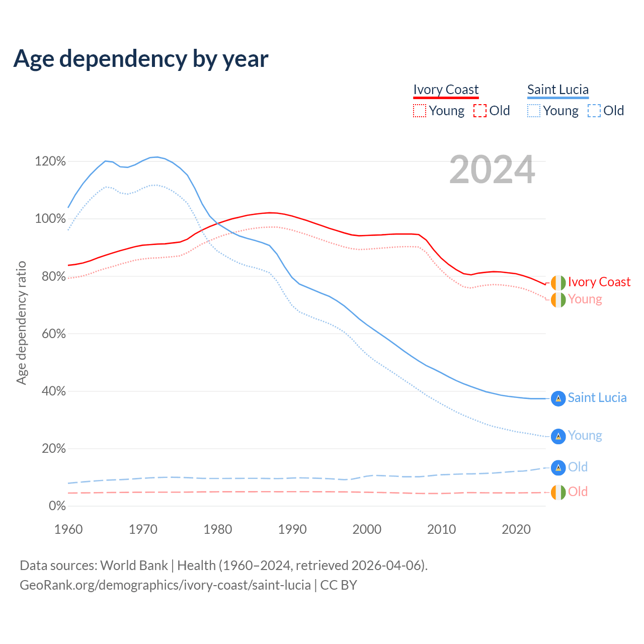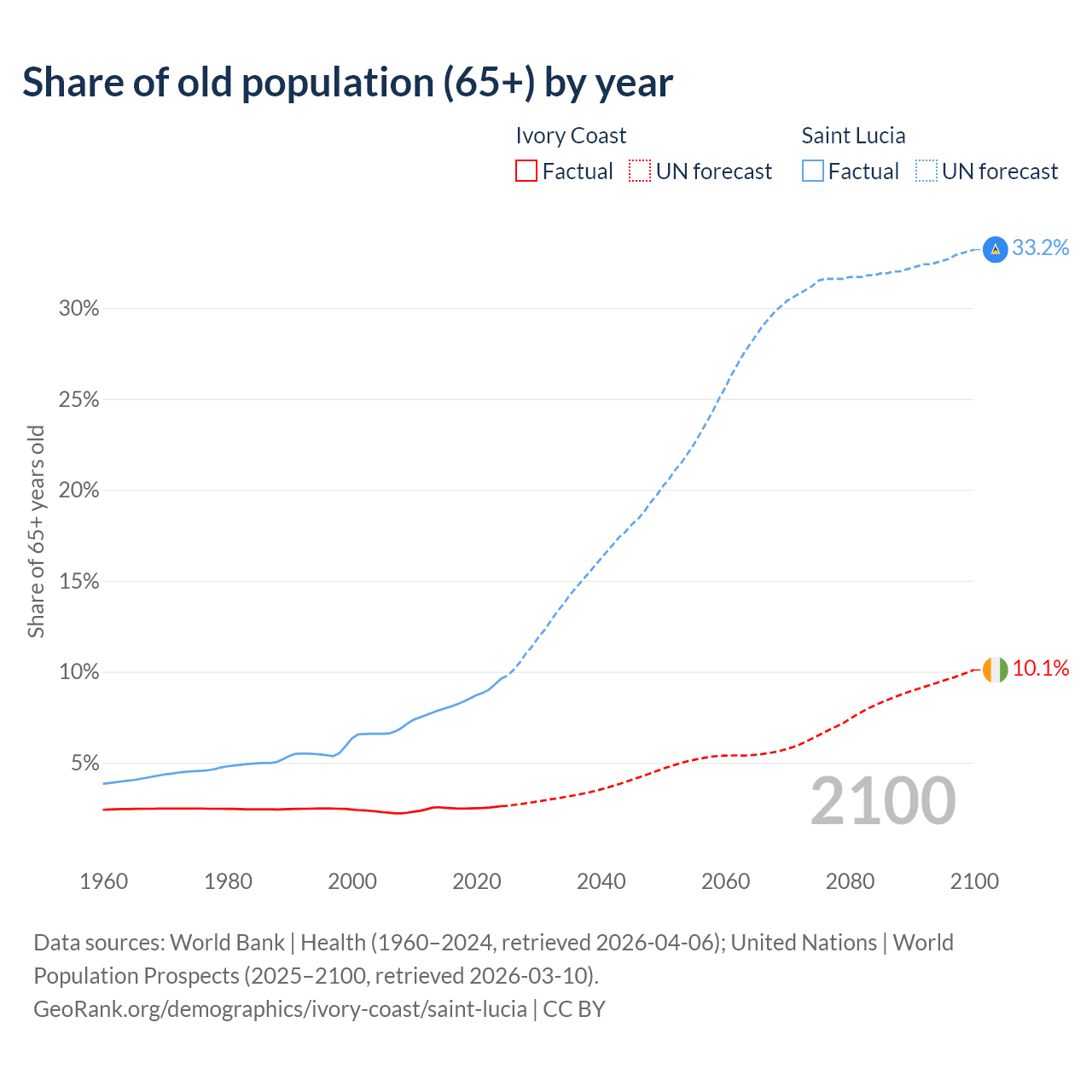 - The share of old-age demographic (65+) in Ivory Coast is 2.61% vs 9.62% in Saint Lucia.