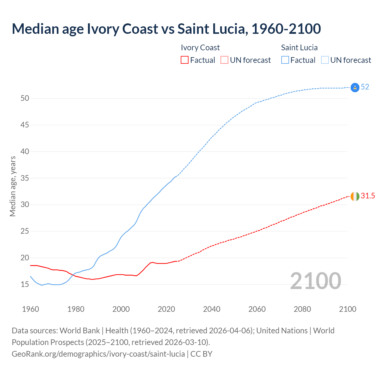 Median age Ivory Coast vs Saint Lucia, 1960-2100