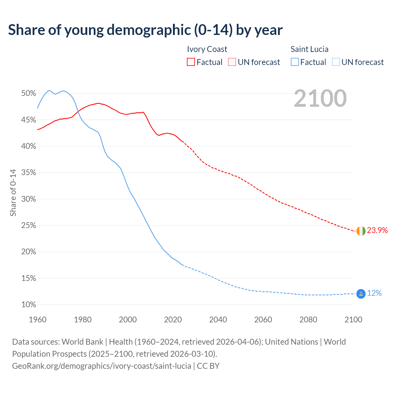 - The share of young demographic (0-15 years old) in Ivory Coast is 40.9% vs 17.5% in Saint Lucia.