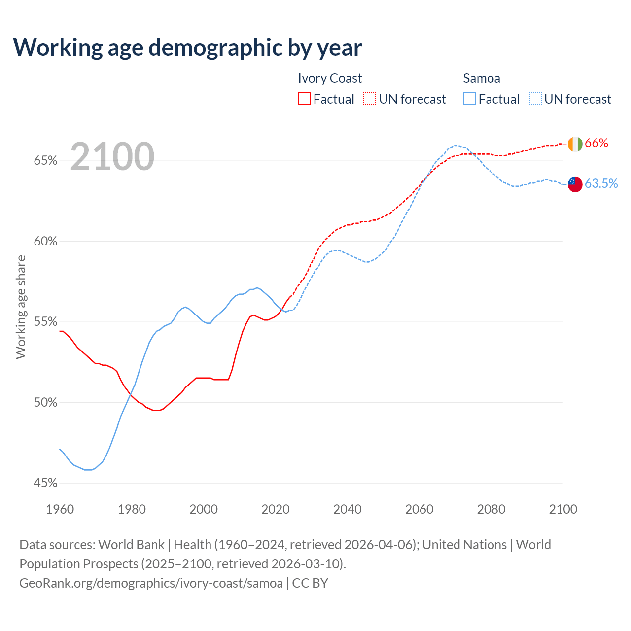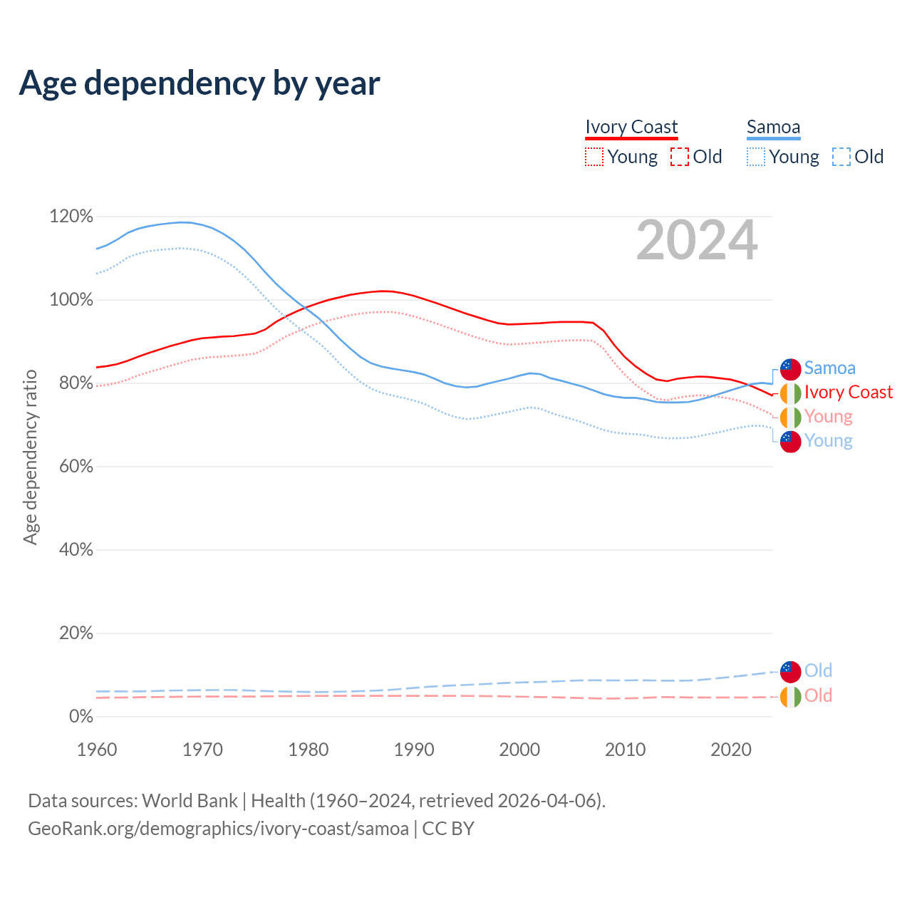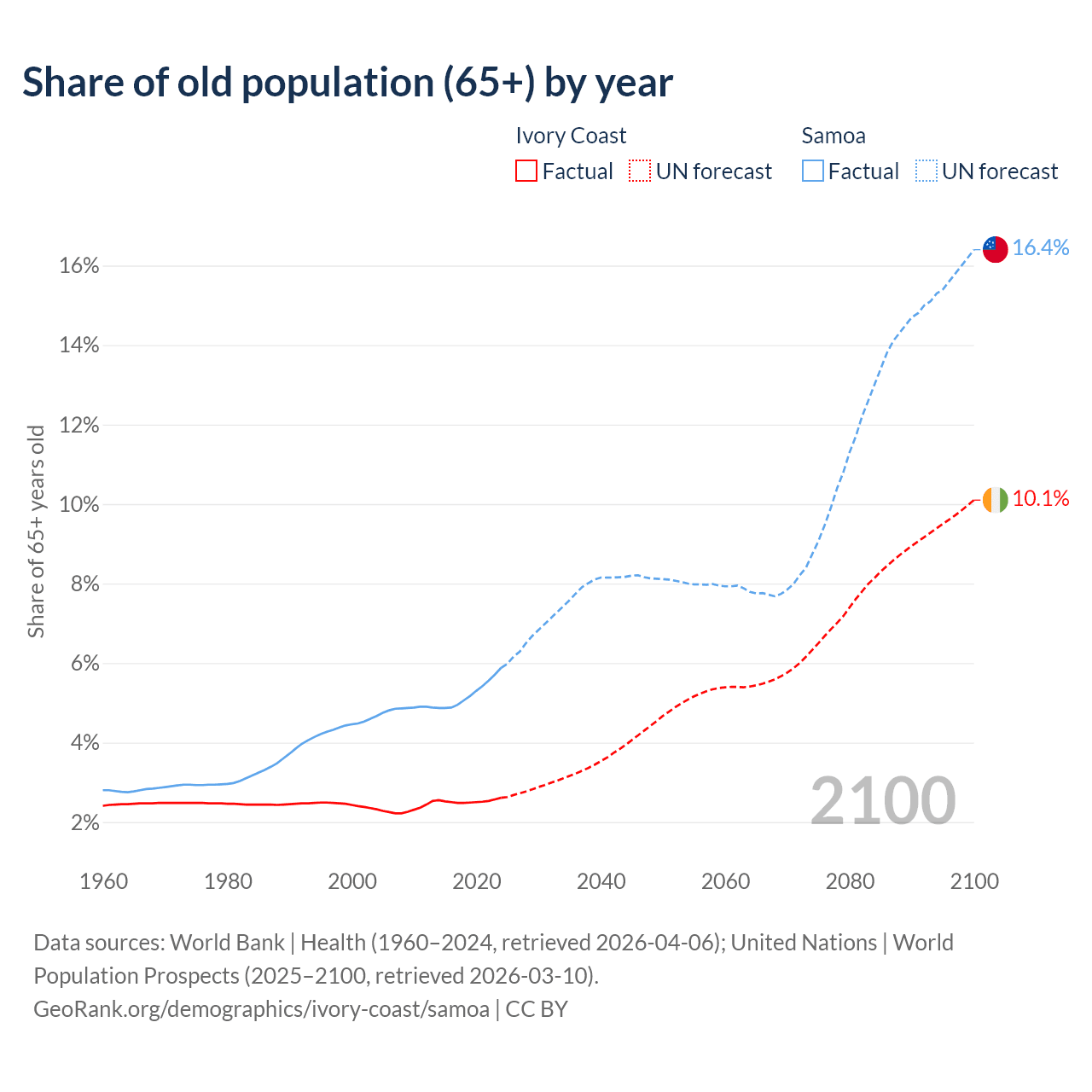 - The share of old-age demographic (65+) in Ivory Coast is 2.61% vs 5.88% in Samoa.