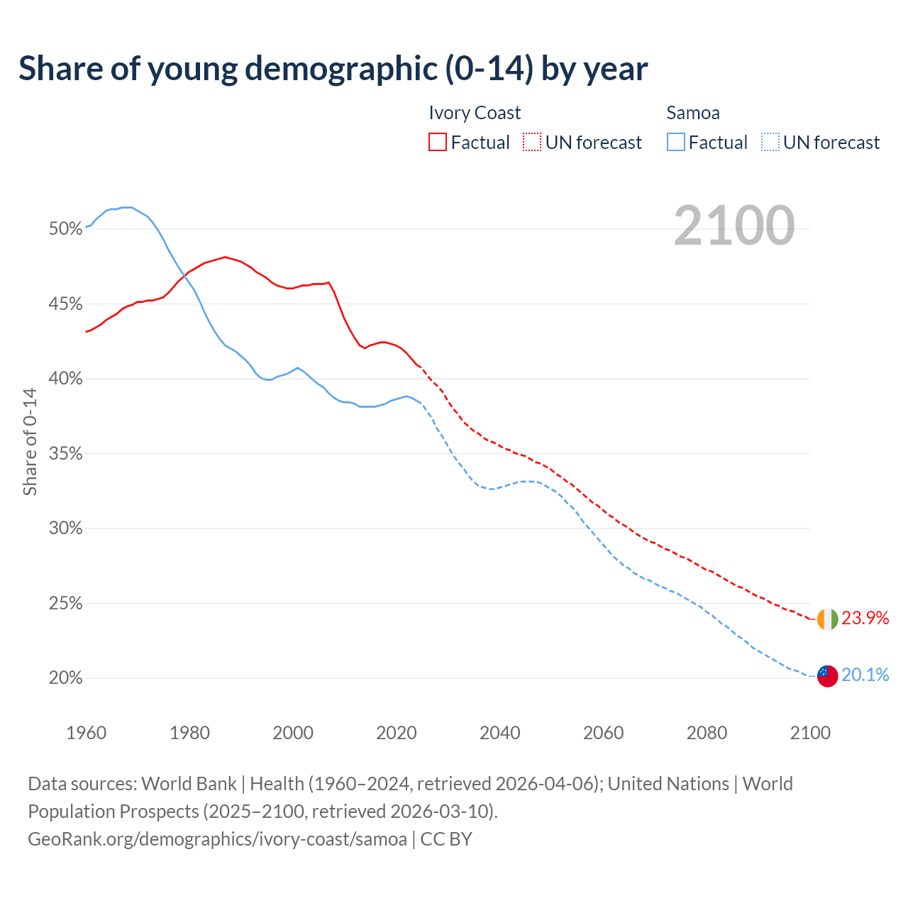 - The share of young demographic (0-15 years old) in Ivory Coast is 40.9% vs 38.5% in Samoa.