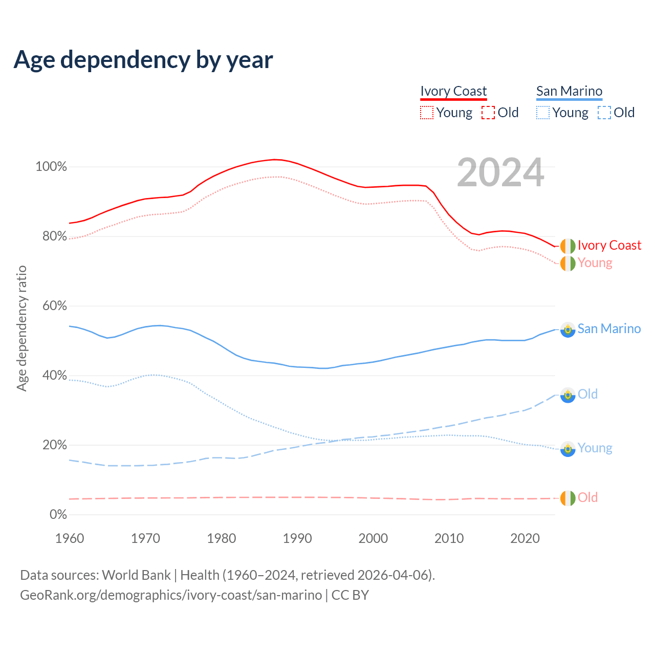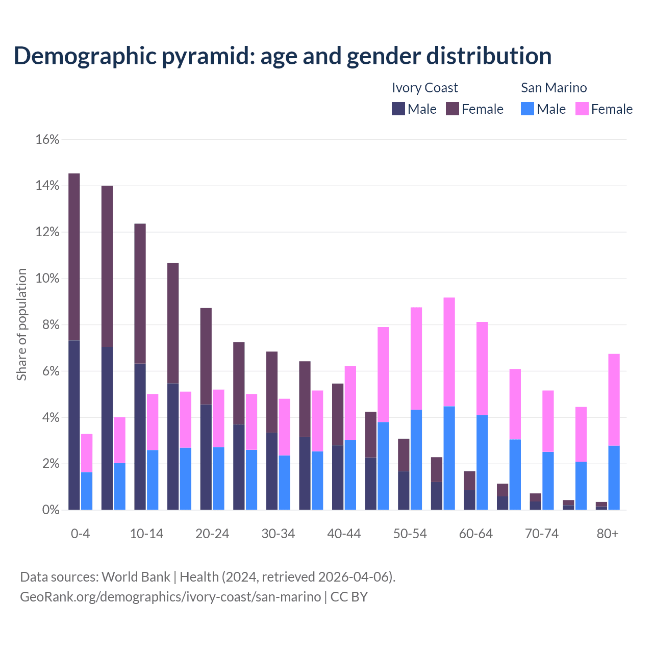- The share of old-age demographic (65+) in Ivory Coast is 2.61% vs 22.4% in San Marino.