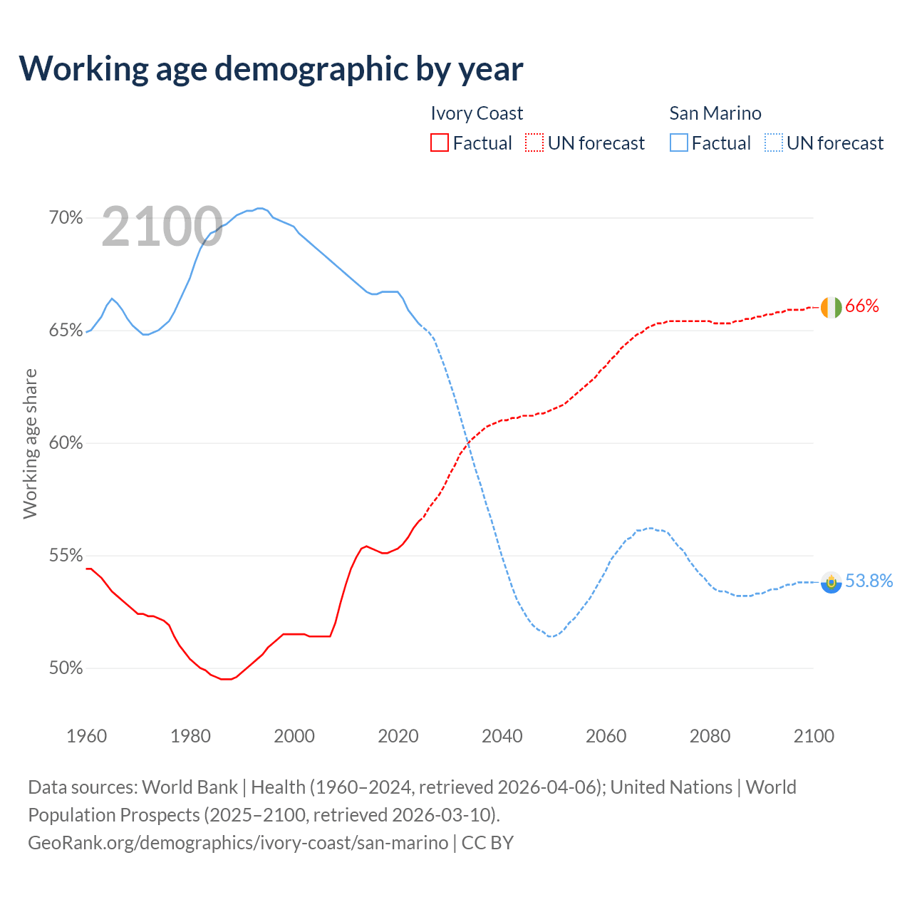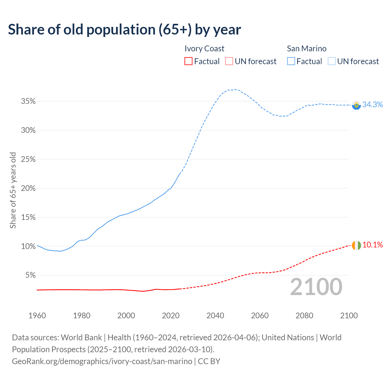The share of older people aged 65 and over is 2.61% in Ivory Coast and 22.4% in San Marino. Life expectancy in Ivory Coast compared to San Marino .