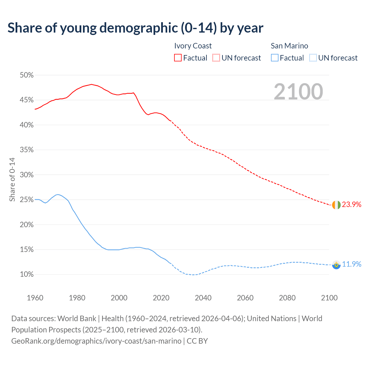 - The share of young demographic (0-15 years old) in Ivory Coast is 40.9% vs 12.3% in San Marino.
