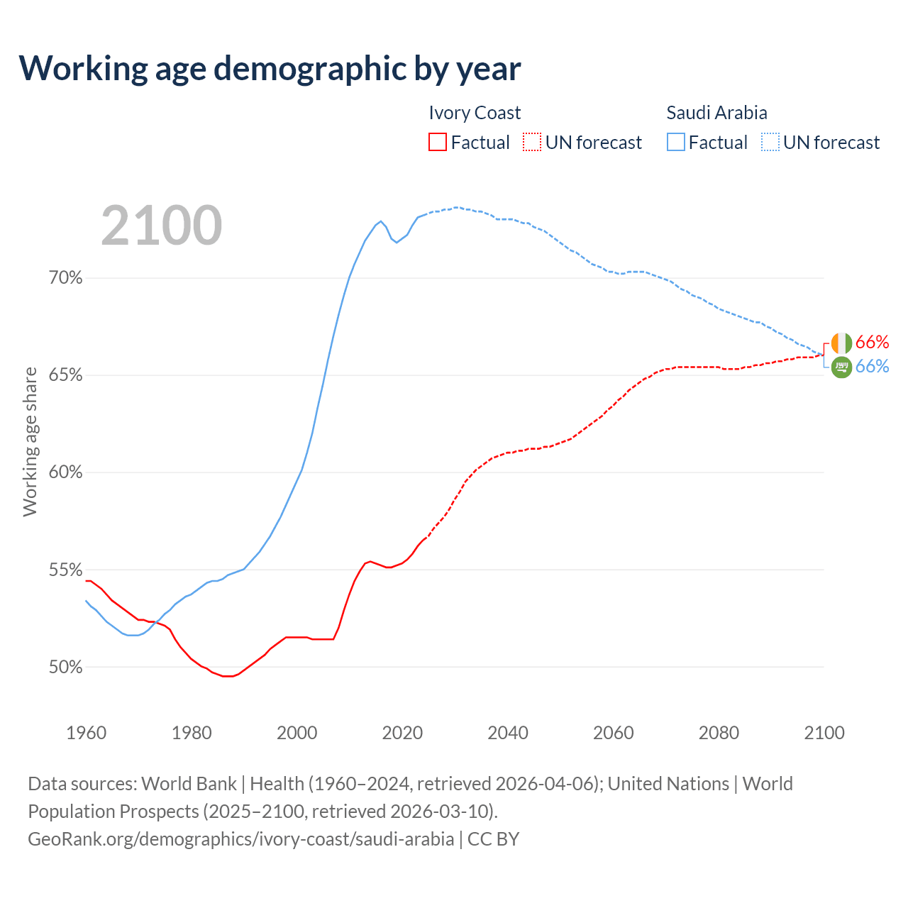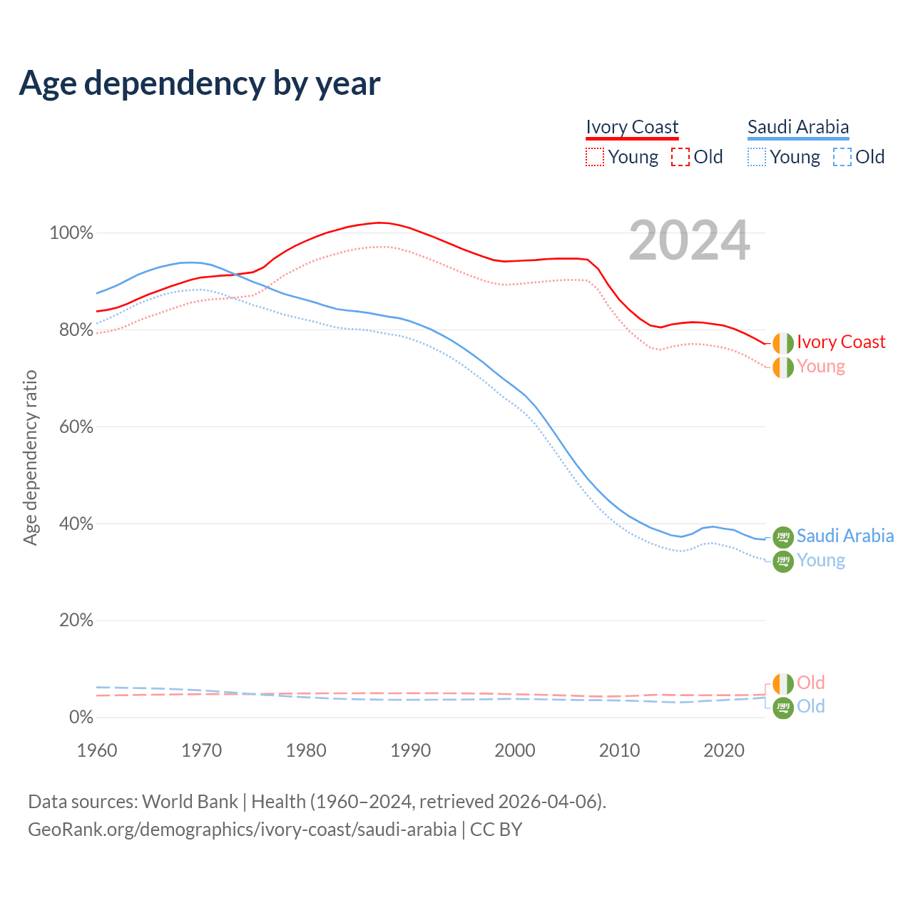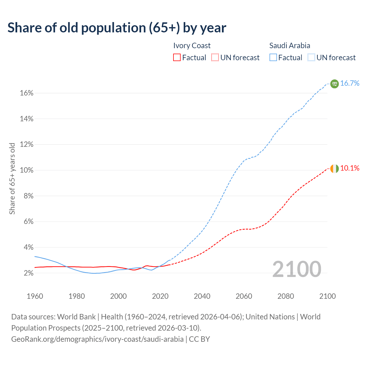 The share of older people aged 65 and over is 2.61% in Ivory Coast and 2.95% in Saudi Arabia. Life expectancy in Ivory Coast compared to Saudi Arabia .