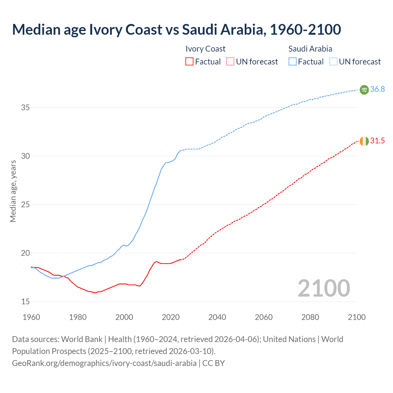 Median age Ivory Coast vs Saudi Arabia, 1960-2100