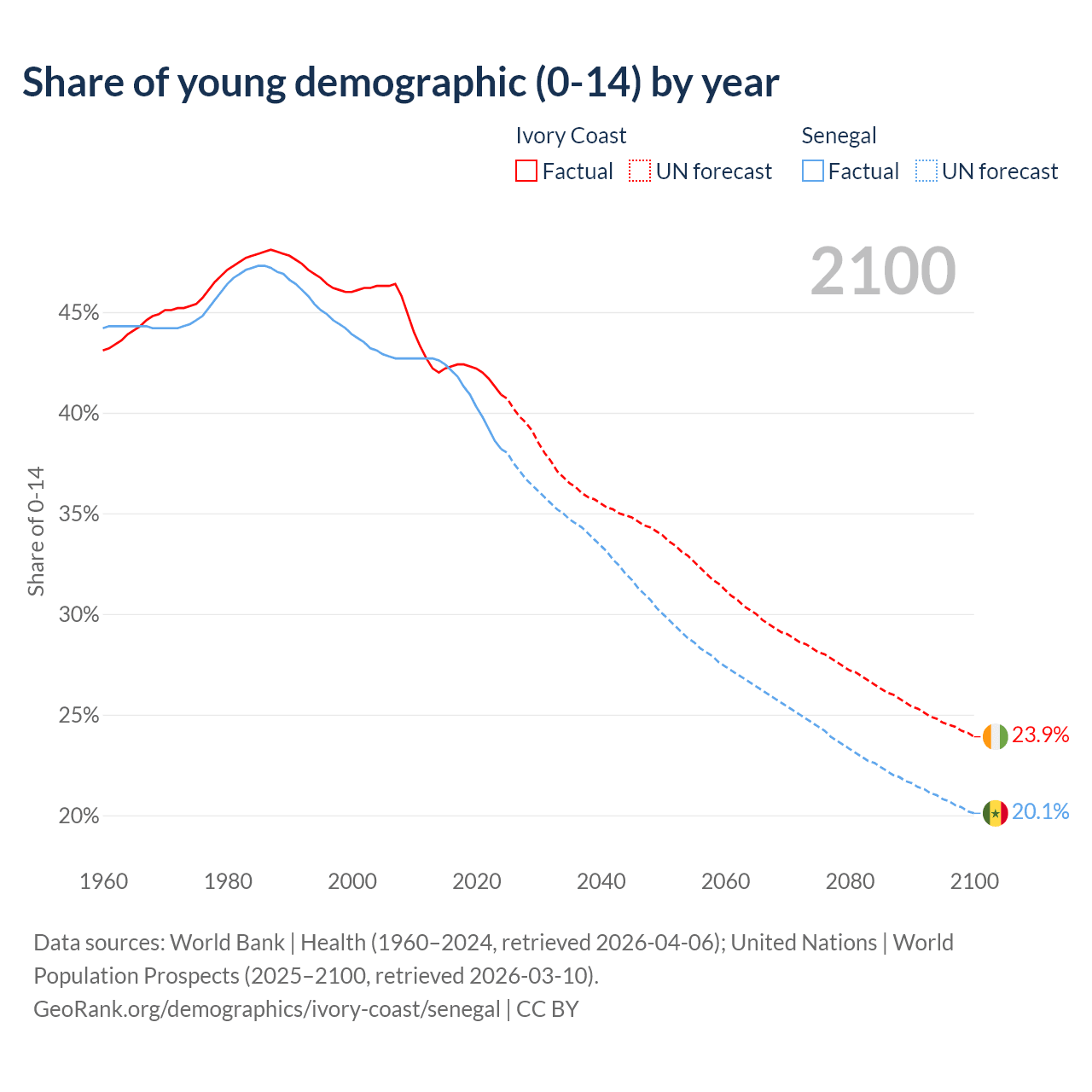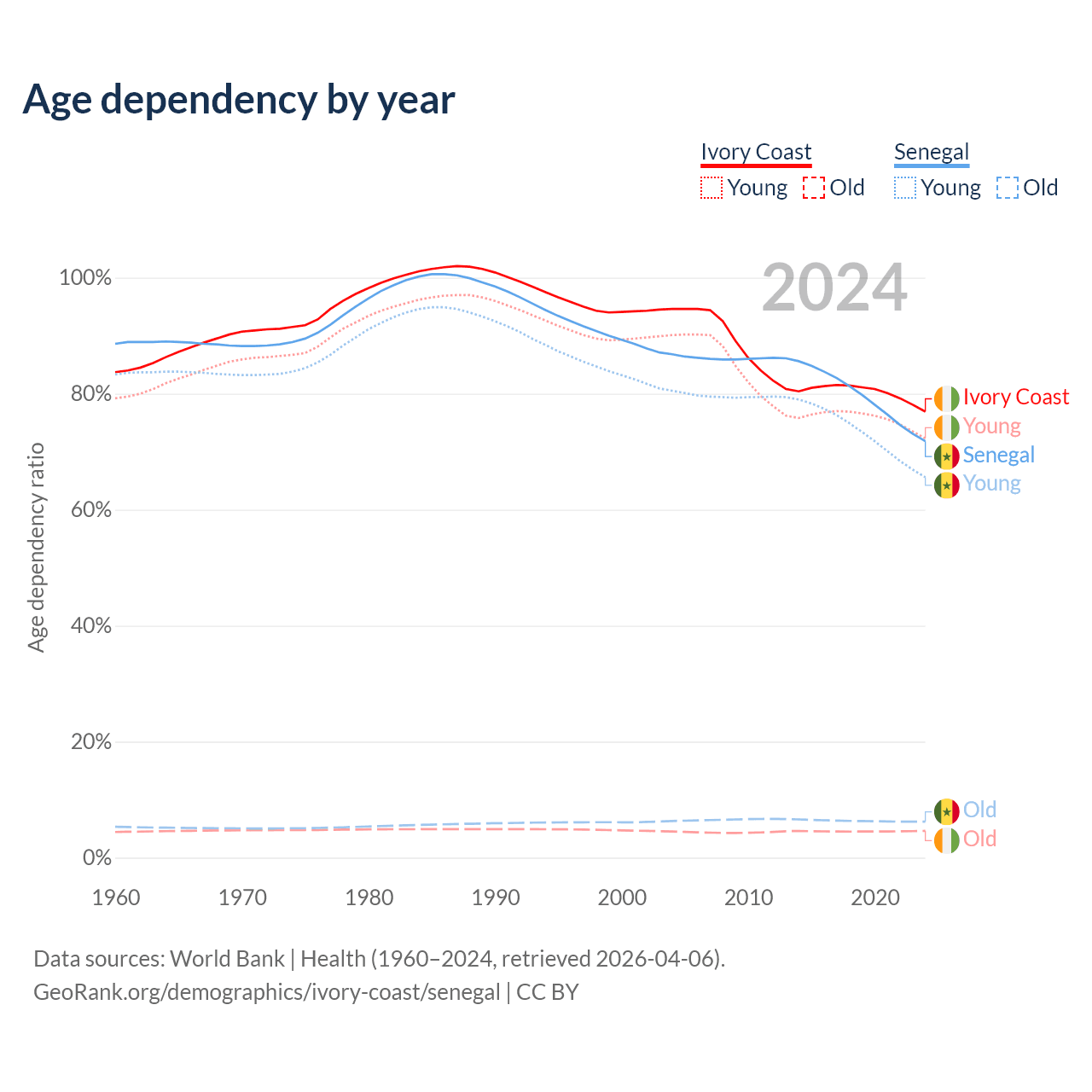 - Ivory Coast is ranked 175/196 by median age (oldest to youngest) vs 162/196 for Senegal.